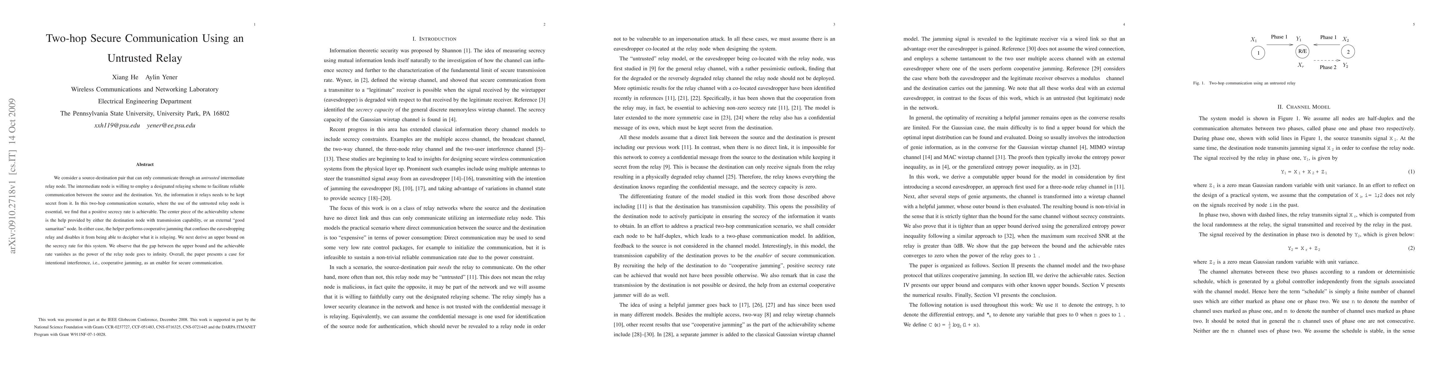 This paper explores secure communication through an untrusted relay node, demonstrating that a positive secrecy rate is achievable by employing cooperative jamming from either the destination or an external helper node to obscure the relayed information from the relay. The study also derives an upper bound on the secrecy rate, showing that the gap between the bound and achievable rate diminishes with increased relay power.