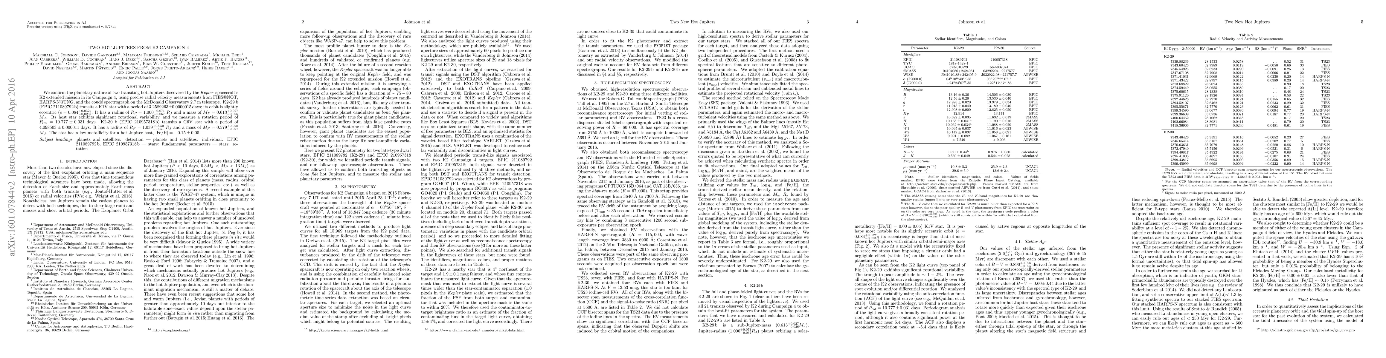 This paper confirms the planetary nature of two hot Jupiters, K2-29 b and K2-30 b, discovered in K2 Campaign 4 using radial velocity data. K2-29 b orbits a K1V star with a period of 3.26 days, while K2-30 b orbits a G6V star with a period of 4.10 days.