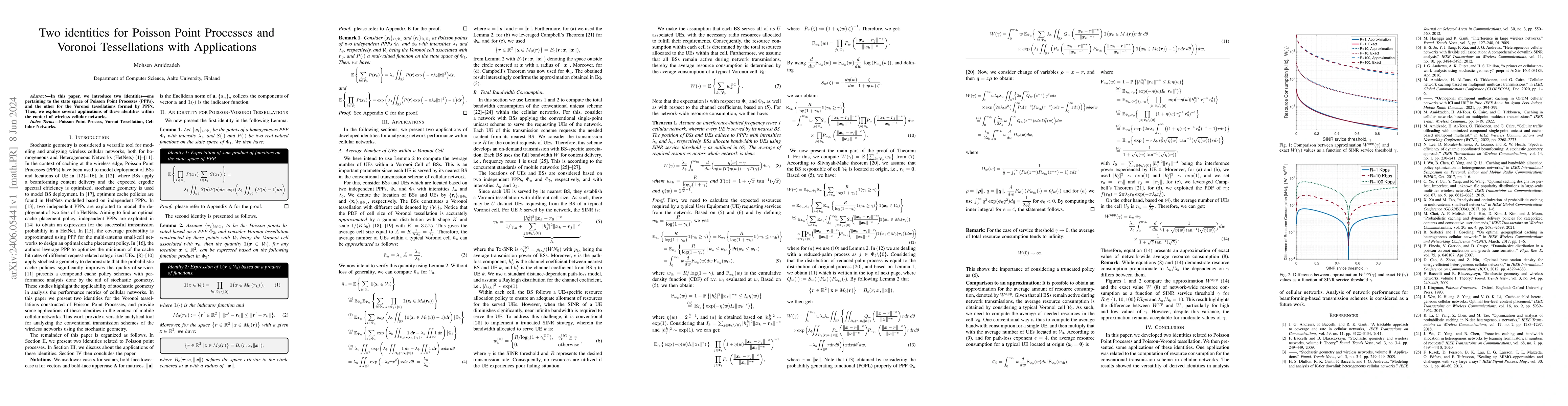 Summary: This paper establishes two key identities related to Poisson Point Processes and their Voronoi tessellations, and applies these findings to enhance the analysis of wireless cellular networks.