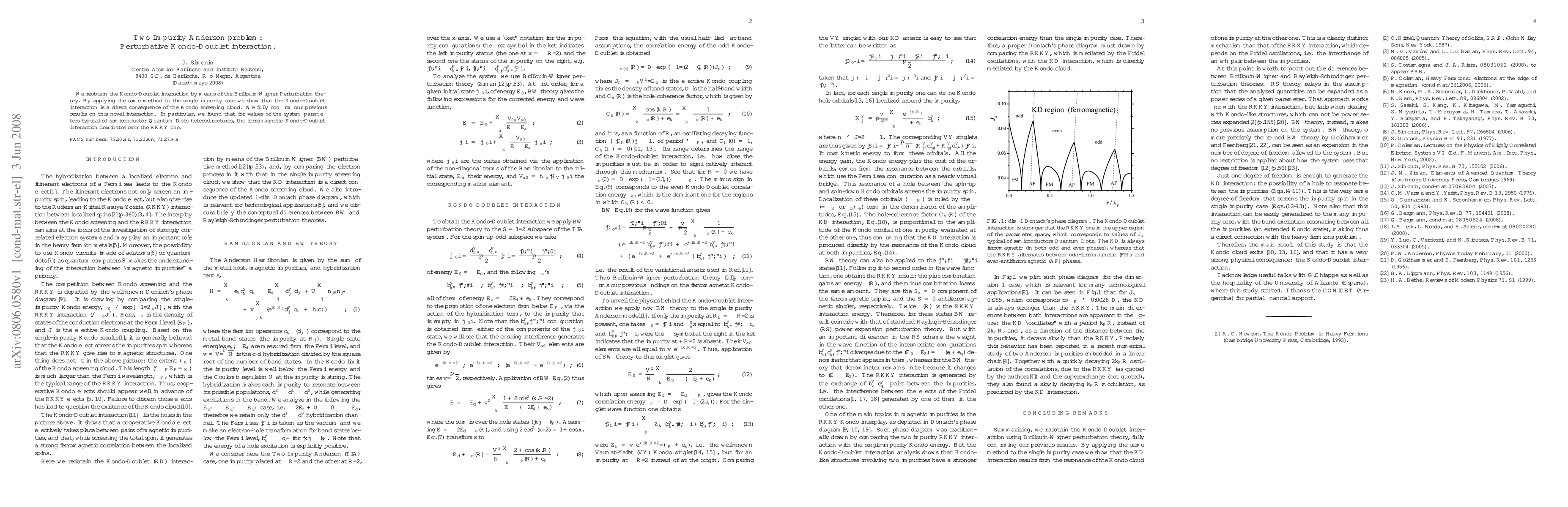 The research employs Brillouin-Wigner perturbation theory to analyze the Two Impurity Anderson problem, specifically focusing on the Kondo-Doublet interaction. The method is also applied to the single impurity case to confirm the findings.