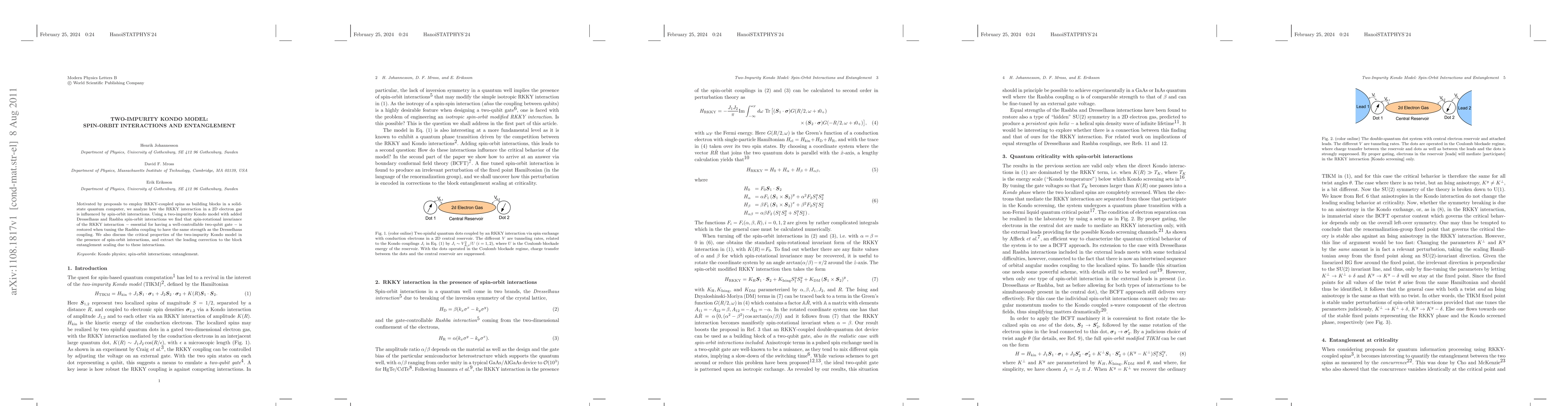 This paper investigates the influence of spin-orbit interactions on the RKKY interaction in a 2D electron gas, revealing that spin-rotational invariance is restored when Rashba coupling equals Dresselhaus coupling strength, crucial for quantum computing. It also explores critical properties and entanglement scaling corrections due to these interactions.