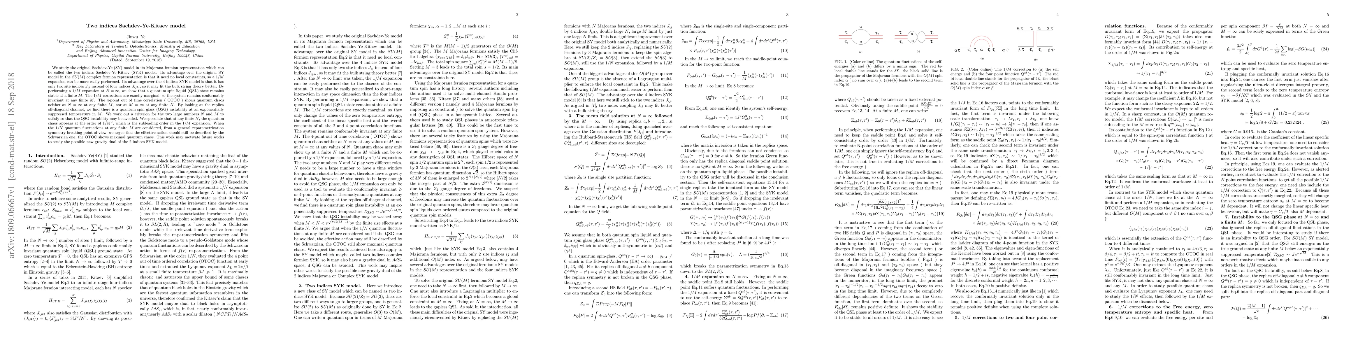 We study the original Sachdev-Ye (SY) model in its Majorana fermion representation which can be called the two indices Sachdev-Ye-Kitaev (SYK) model. Its advantage over the original SY model in the $ SU(M) $ complex fermion representation is that it need no local constraints, so a $1/M $ expansion can be more easily performed. Its advantage over the 4 indices SYK model is that it has only two site indices $ J_{ij} $ instead of four indices $ J_{ijkl} $, so it may fit the bulk string theory better. By performing a $1/M $ expansion at $ N=\infty $, we show that a quantum spin liquid (QSL) state remains stable at a finite $ M $. The $ 1/M $ corrections are exactly marginal, so the system remains conformably invariant at any finite $ M $. The 4-point out of time correlation ( OTOC ) shows quantum chaos neither at $ N=\infty $ at any finite $ M $, nor at $ M=\infty $ at any finite $ N $. By looking at the replica off-diagonal channel, we find there is a quantum spin glass (QSG) instability at an exponentially suppressed temperature in $ M $. We work out a criterion for the two large numbers $ N $ and $ M $ to satisfy so that the QSG instability may be avoided. We speculate that at any finite $ N $, the quantum chaos appears at the order of $ 1/M^{0} $, which is the subleading order in the $ 1/M $ expansion. When the $ 1/N $ quantum fluctuations at any finite $ M $ are considered, from a general reparametrization symmetry breaking point of view, we argue that the eThis work may motivate future works to study the possible new gravity dual of the 2 indices SYK model.ffective action should still be described by the Schwarzian one, the OTOC shows maximal quantum chaos.