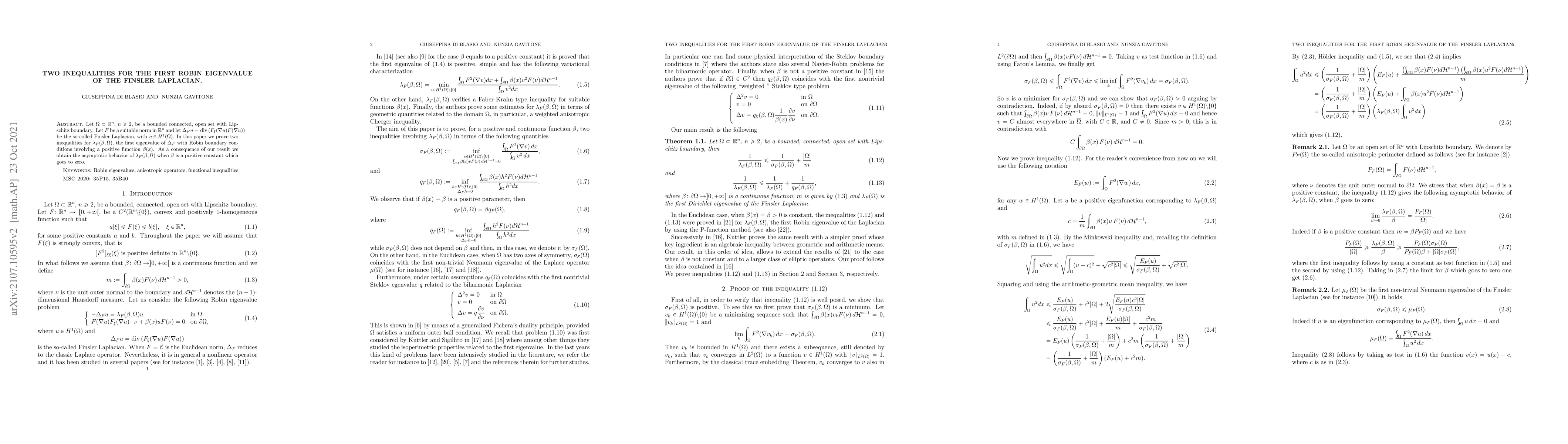 This paper proves two inequalities for the first Robin eigenvalue of the Finsler Laplacian, involving the function β, and derives the asymptotic behavior of this eigenvalue as β approaches zero.