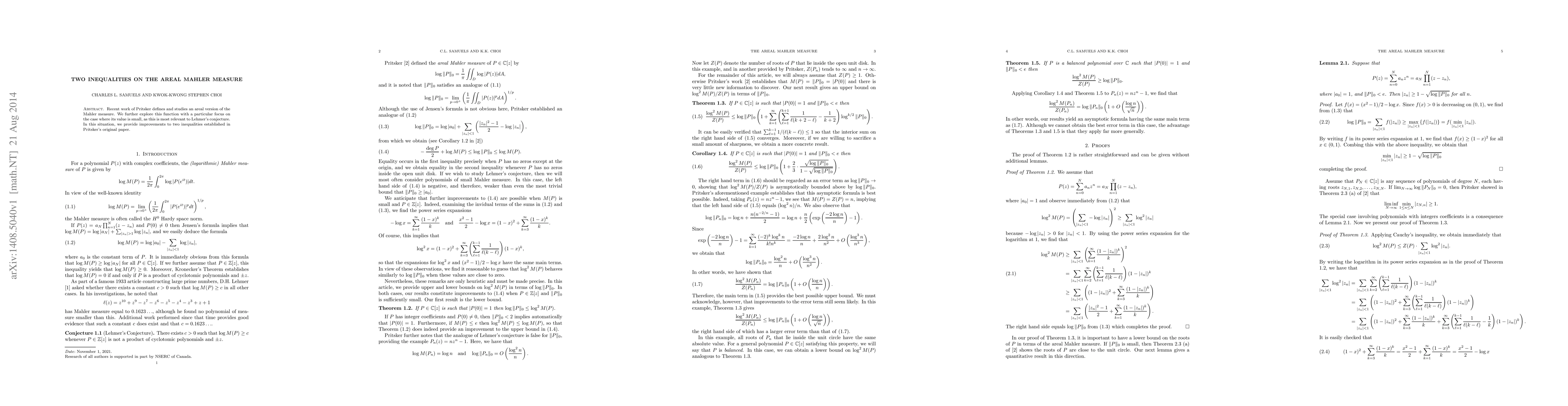 This paper builds on Pritsker's work on the areal Mahler measure, refining two inequalities that apply when the measure is small, which is crucial for addressing Lehmer's conjecture. The improvements aim to better understand the behavior of the measure in relevant scenarios.