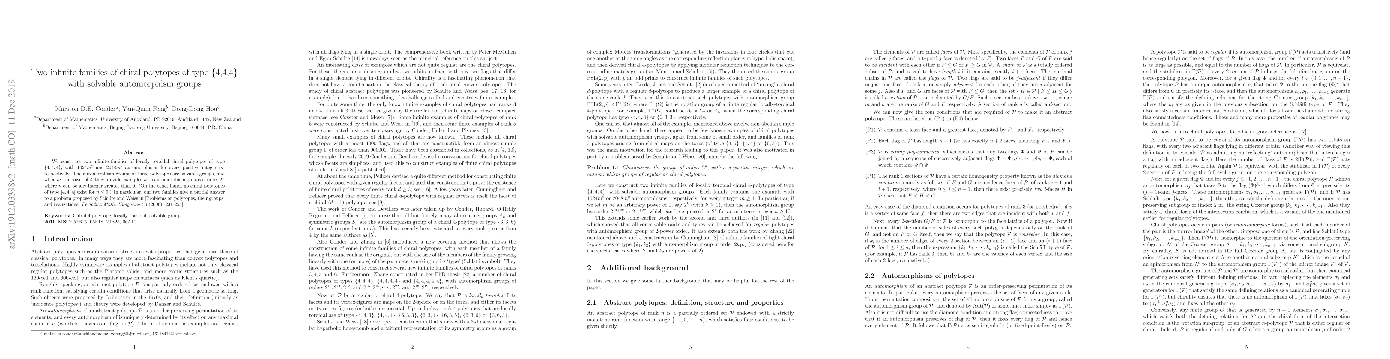 Researchers discover two infinite families of chiral polytopes with 1024m^2 and 2048m^2 automorphisms, providing examples of solvable groups for a problem posed by Schulte and Weiss.