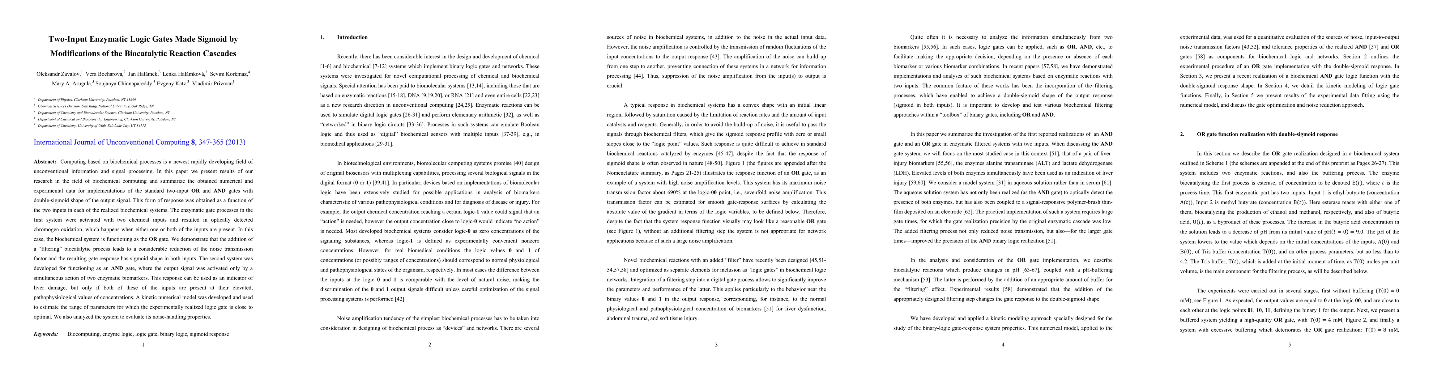This paper investigates biochemical computing, presenting two-input enzymatic logic gates with sigmoid output responses. The OR gate activates with either one or both inputs, while the AND gate requires both inputs to be present at elevated concentrations to activate, demonstrating potential for liver damage detection.