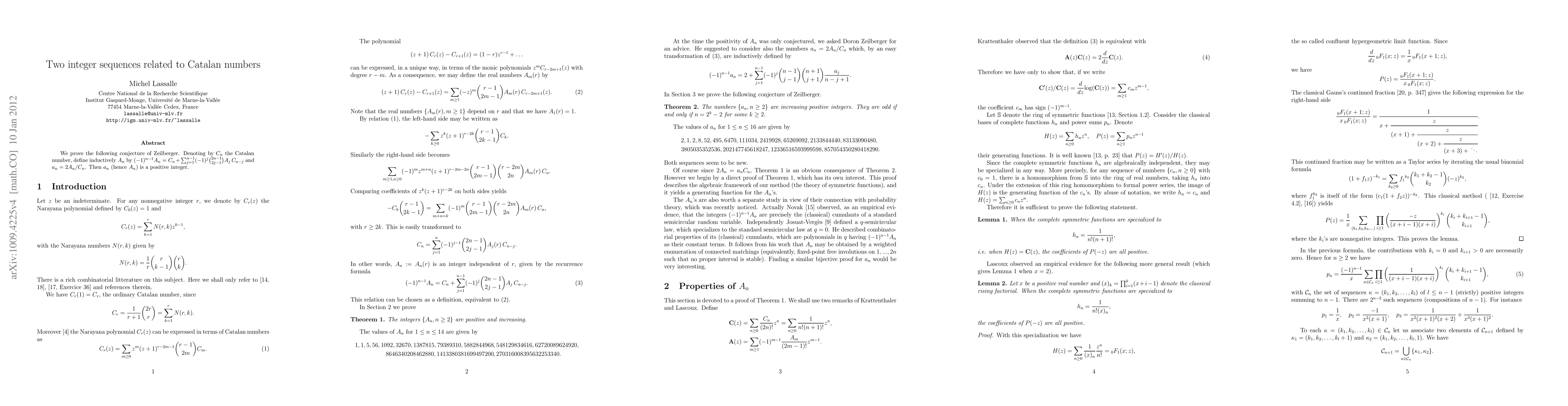 We prove the following conjecture of Zeilberger. Denoting by $C_n$ the Catalan number, define inductively $A_n$ by $(-1)^{n-1}A_n=C_n+\sum_{j=1}^{n-1} (-1)^{j} \binom{2n-1}{2j-1} A_j \,C_{n-j}$ and $a_n=2A_n/C_n$. Then $a_n$ (hence $A_n$) is a positive integer.