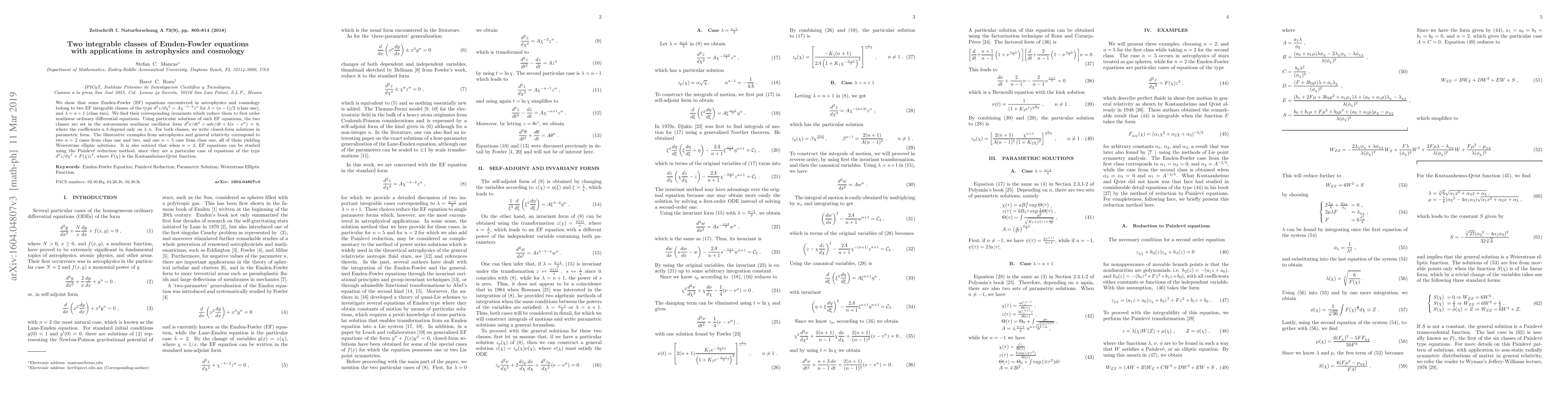 We show that some Emden-Fowler (EF) equations encountered in astrophysics and cosmology belong to two EF integrable classes of the type d^2z/d{\chi}^2=A \chi^{-\lambda-2}z^n for \lambda=(n-1)/2 (class one), and \lambda=n+1 (class two). We find their corresponding invariants which reduce them to first order nonlinear ordinary differential equations. Using particular solutions of such EF equations, the two classes are set in the autonomous nonlinear oscillator form d^2\nu/dt^2 +ad \nu/dt +b(\nu-\nu^n)=0, where the coefficients a,b depend only on \lambda, n. For both classes, we write closed-form solutions in parametric form. The illustrative examples from astrophysics and general relativity correspond to two n=2 cases from class one and two, and one n=5 case from class one, all of them yielding Weierstrass elliptic solutions. It is also noticed that when n=2, EF equations can be studied using the Painlev\'e reduction method, since they are a particular case of equations of the type d^2z/d{\chi}^2=F(\chi)z^2, where F(\chi) is the Kustaanheimo-Qvist function