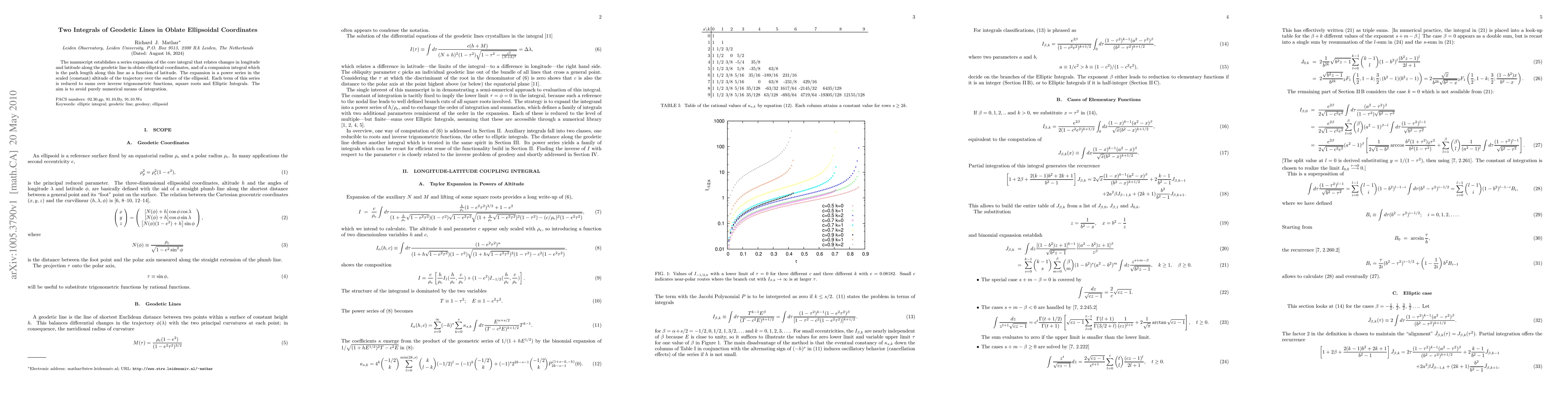 This paper develops a power series expansion for integrals related to geodetic lines in oblate ellipsoidal coordinates, expressing them in terms of inverse trigonometric functions, square roots, and Elliptic Integrals to avoid purely numerical integration methods. The focus is on the changes in longitude and latitude and the path length along the geodetic line.