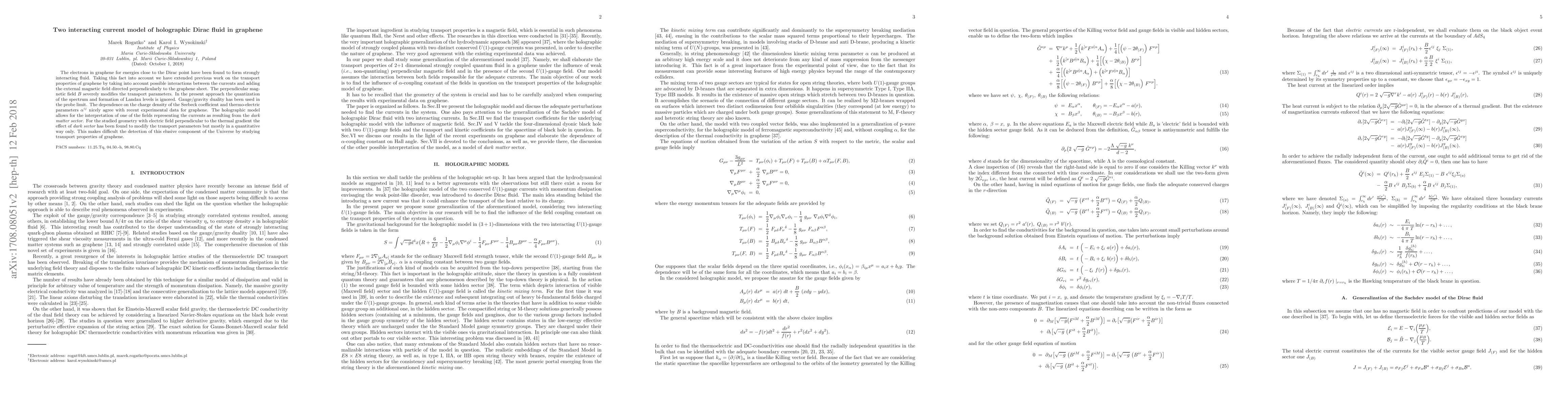 The electrons in graphene for energies close to the Dirac point have been found to form strongly interacting fluid. Taking this fact into account we have extended previous work on the transport properties of graphene by taking into account possible interactions between the currents and adding the external magnetic field directed perpendicularly to the graphene sheet. The perpendicular mag- netic field B severely modifies the transport parameters. In the present approach the quantization of the spectrum and formation of Landau levels is ignored. Gauge/gravity duality has been used in the probe limit. The dependence on the charge density of the Seebeck coefficient and thermo-electric parameters {\alpha}ij nicely agree with recent experimental data for graphene. The holographic model allows for the interpretation of one of the fields representing the currents as resulting from the dark matter sector. For the studied geometry with electric field perpendicular to the thermal gradient the effect of dark sector has been found to modify the transport parameters but mostly in a quantitative way only. This makes difficult the detection of this elusive component of the Universe by studying transport properties of graphene.