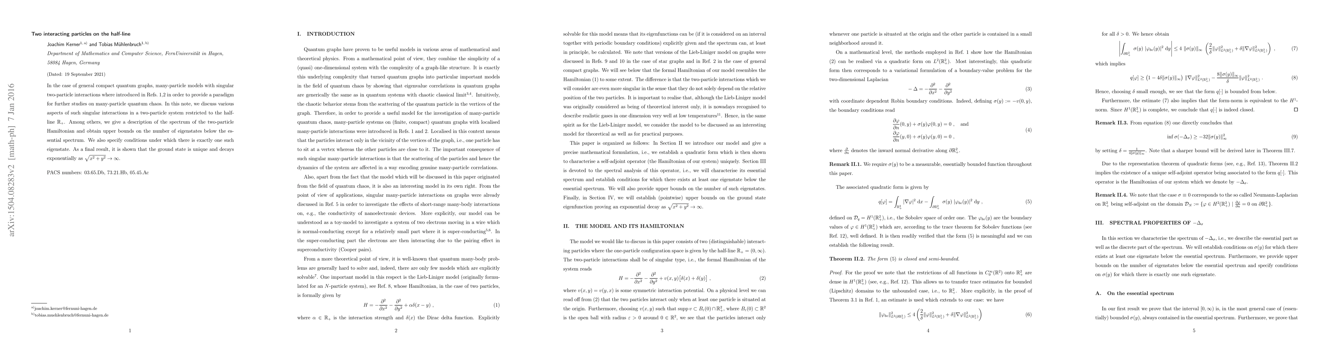 In the case of compact quantum graphs, many-particle models with singular two-particle interactions where introduced in [arXiv:1207.5648, arXiv:1112.4751] to provide a paradigm for further studies on many-particle quantum chaos. In this note, we discuss various aspects of such singular interactions in a two-particle system restricted to the half-line $\mathbb{R}_+$. Among others, we give a description of the spectrum of the two-particle Hamiltonian and obtain upper bounds on the number of eigenstates below the essential spectrum. We also specify conditions under which there is exactly one such eigenstate. As a final result, it is shown that the ground state is unique and decays exponentially as $\sqrt{x^2+y^2} \to \infty$.
