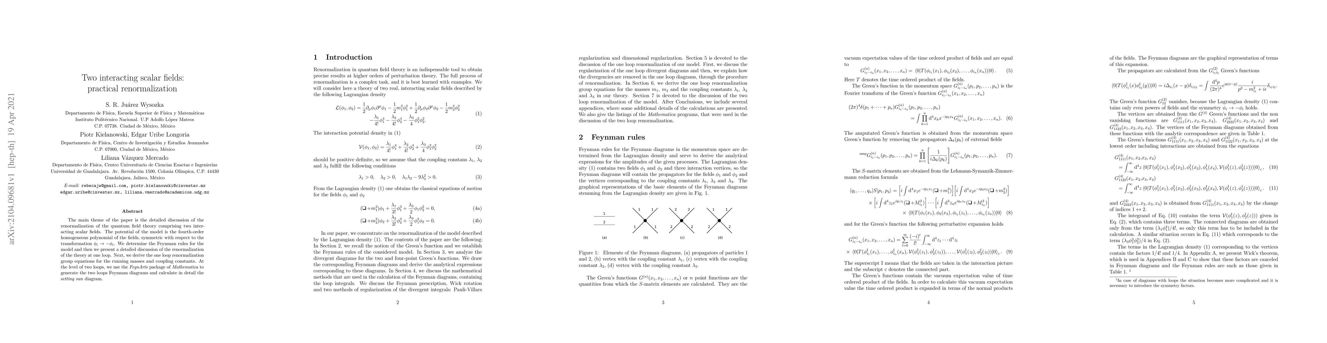 This paper discusses the renormalization of a quantum field theory with two interacting scalar fields, focusing on the fourth-order symmetric polynomial potential. It derives Feynman rules and examines the one-loop renormalization, followed by the derivation of one-loop renormalization group equations for running masses and coupling constants. The paper also employs Mathematica to generate and analyze two-loop Feynman diagrams, specifically the setting sun diagram.
