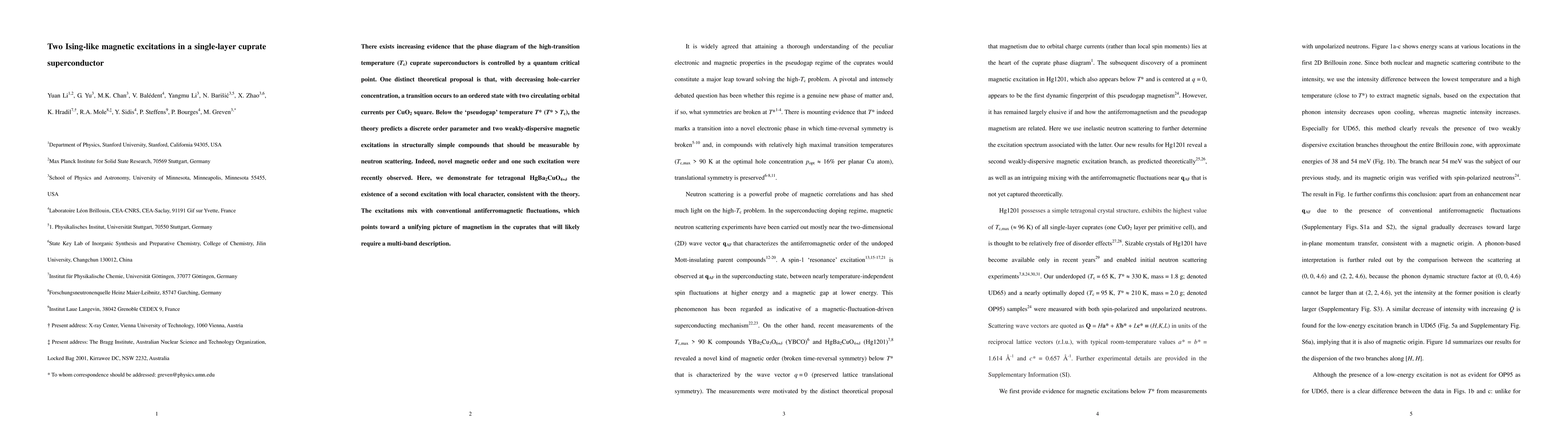 This paper reports the discovery of two distinct Ising-like magnetic excitations in the single-layer cuprate superconductor HgBa2CuO4+d, supporting theoretical predictions of a quantum critical point in the phase diagram. The findings suggest a complex interplay between these excitations and conventional antiferromagnetic fluctuations, indicating a multi-band description of magnetism in cuprates.