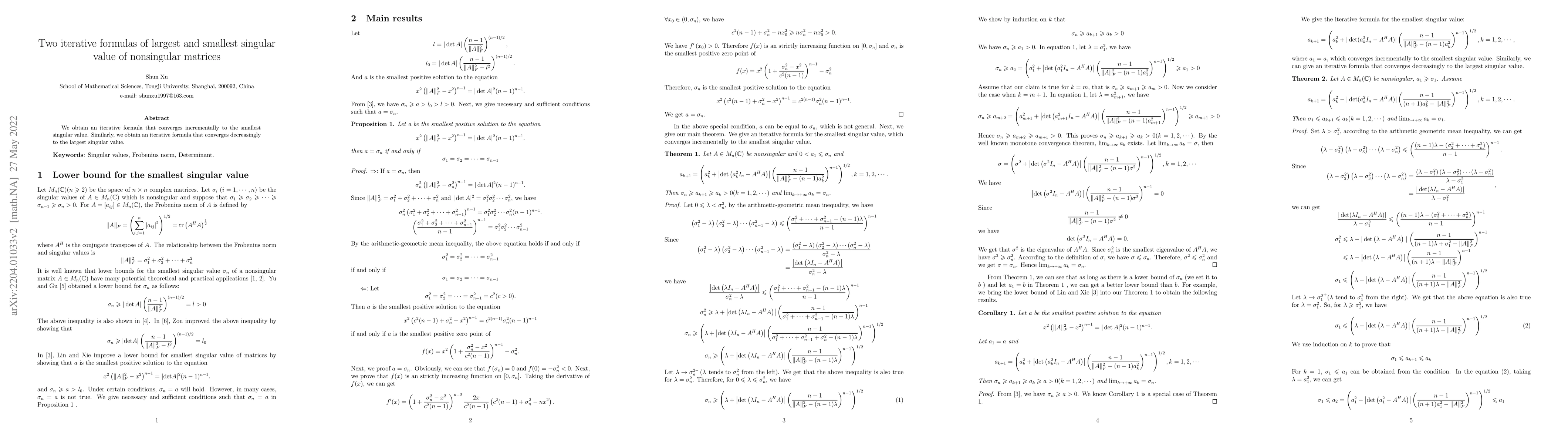 Summary: This paper presents two iterative formulas: one that incrementally converges to the smallest singular value, and another that decreasingly converges to the largest singular value of nonsingular matrices. These methods provide efficient numerical approaches for determining extreme singular values.