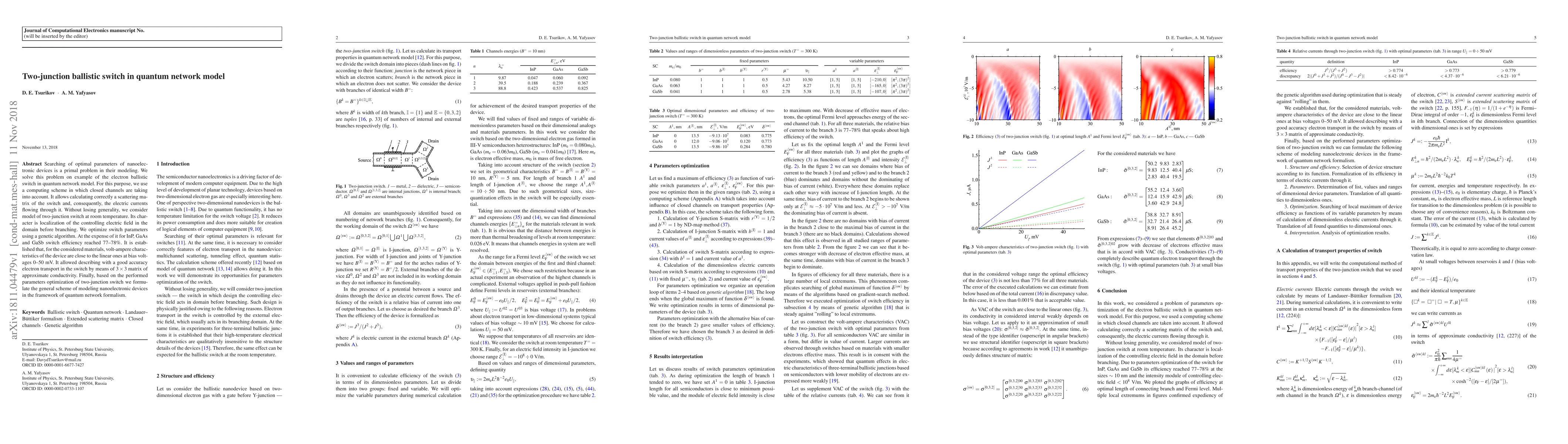 Searching of optimal parameters of nanoelectronic devices is a primal problem in their modeling. We solve this problem on example of the electron ballistic switch in quantum network model. For this purpose, we use a computing scheme in which closed channels are taking into account. It allows calculating correctly a scattering matrix of the switch and, consequently, the electric currents flowing through it. Without losing generality, we consider model of two-junction switch at room temperature. Its character is localization of the controlling electric field in the domain before branching. We optimize switch parameters using a genetic algorithm. At the expense of it for InP, GaAs and GaSb switch efficiency reached 77-78%. It is established that, for the considered materials, volt-ampere characteristics of the device are close to the linear ones at bias voltages 0-50 mV. It allowed describing with a good accuracy electron transport in the switch by means of $3\times 3$ matrix of approximate conductivity. Finally, based on the performed parameters optimization of two-junction switch we formulate the general scheme of modeling nanoelectronic devices in the framework of quantum network formalism.
