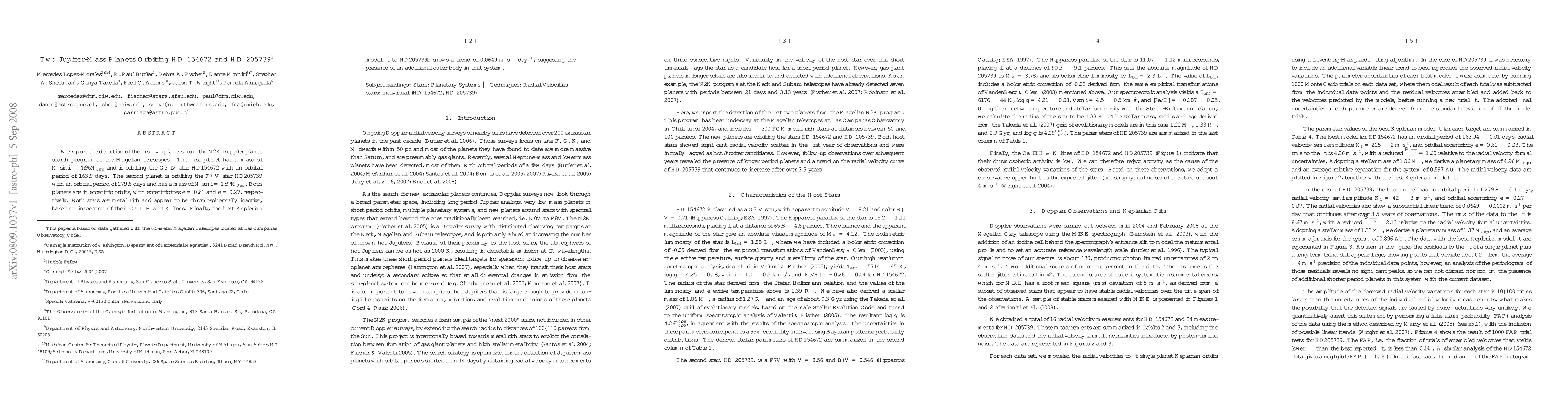 We report the detection of the first two planets from the N2K Doppler planet search program at the Magellan telescopes. The first planet has a mass of M sin i = 4.96 M_Jup and is orbiting the G3 IV star HD154672 with an orbital period of 163.9 days. The second planet is orbiting the F7 V star HD205739 with an orbital period of 279.8 days and has a mass of M sin i = 1.37 M_Jup. Both planets are in eccentric orbits, with eccentricities e = 0.61 and e = 0.27, respectively. Both stars are metal rich and appear to be chromospherically inactive, based on inspection of their Ca II H and K lines. Finally, the best Keplerian model fit to HD205739b shows a trend of 0.0649 m/s/day, suggesting the presence of an additional outer body in that system.