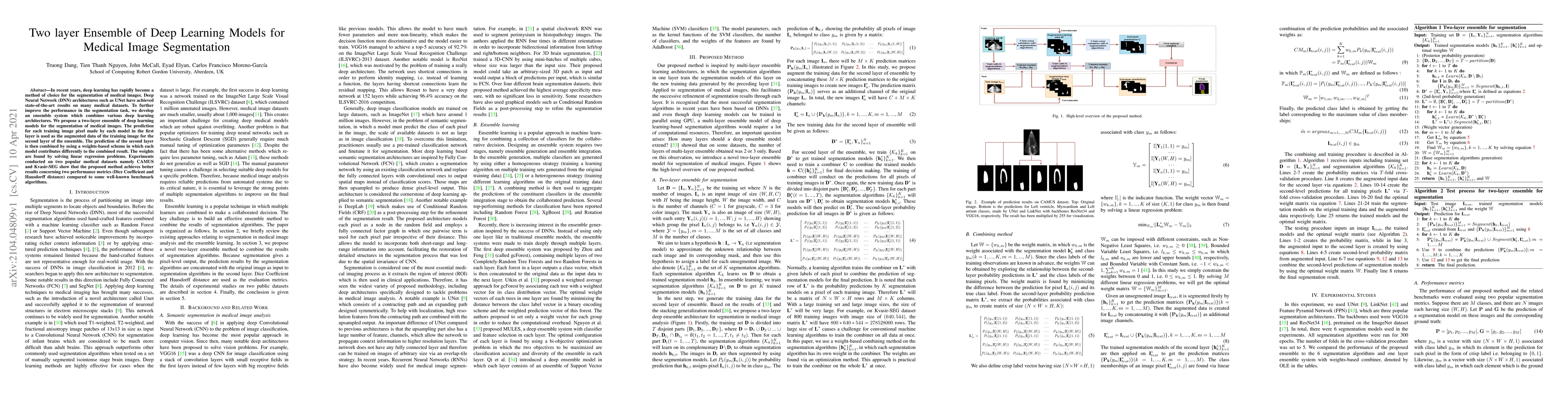 In recent years, deep learning has rapidly become a method of choice for the segmentation of medical images. Deep Neural Network (DNN) architectures such as UNet have achieved state-of-the-art results on many medical datasets. To further improve the performance in the segmentation task, we develop an ensemble system which combines various deep learning architectures. We propose a two-layer ensemble of deep learning models for the segmentation of medical images. The prediction for each training image pixel made by each model in the first layer is used as the augmented data of the training image for the second layer of the ensemble. The prediction of the second layer is then combined by using a weights-based scheme in which each model contributes differently to the combined result. The weights are found by solving linear regression problems. Experiments conducted on two popular medical datasets namely CAMUS and Kvasir-SEG show that the proposed method achieves better results concerning two performance metrics (Dice Coefficient and Hausdorff distance) compared to some well-known benchmark algorithms.