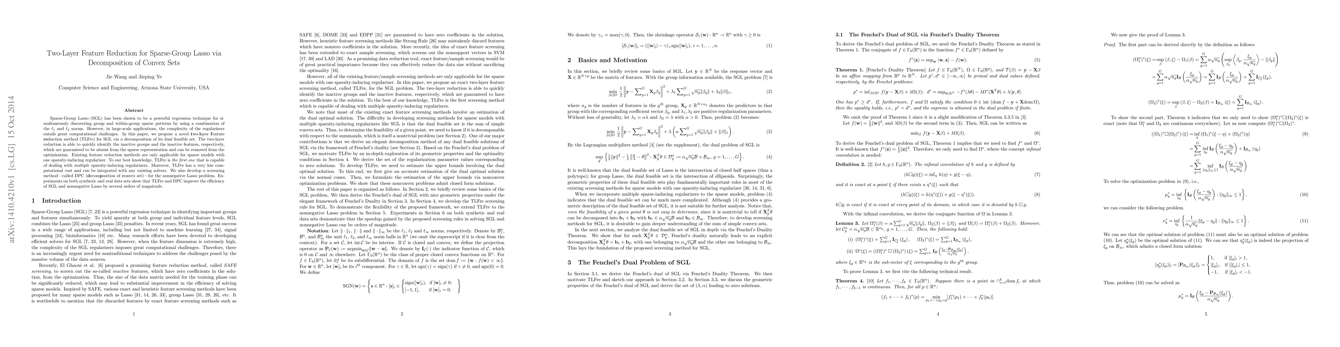 This paper introduces a Two-Layer Feature Reduction method (TLFre) for Sparse-Group Lasso, which leverages decomposition of convex sets to quickly identify and remove inactive groups and features, significantly reducing computational complexity. TLFre is the first method capable of handling multiple sparsity-inducing regularizers and integrates efficiently with existing solvers.