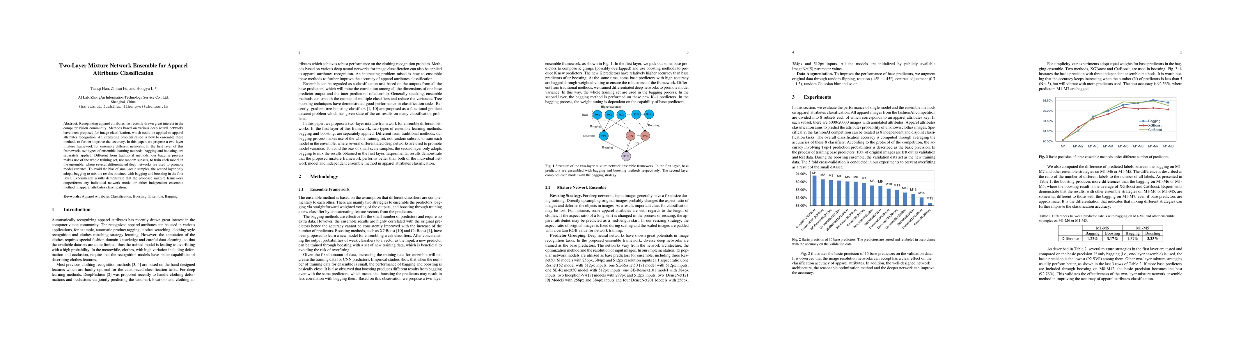 This paper proposes a two-layer ensemble framework using bagging and boosting for apparel attributes classification. The first layer employs both methods, with bagging utilizing the full training set to train diverse deep networks, while the second layer uses bagging to combine results from the first layer, achieving superior performance compared to individual networks or single ensemble methods.