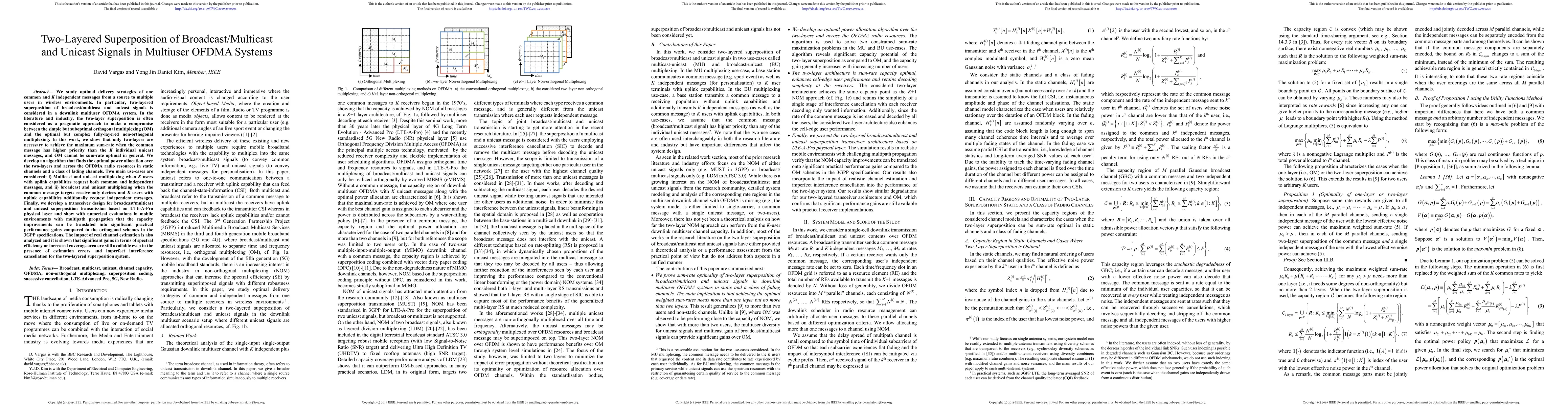 We study optimal delivery strategies of one common and $K$ independent messages from a source to multiple users in wireless environments. In particular, two-layered superposition of broadcast/multicast and unicast signals is considered in a downlink multiuser OFDMA system. In the literature and industry, the two-layer superposition is often considered as a pragmatic approach to make a compromise between the simple but suboptimal orthogonal multiplexing (OM) and the optimal but complex fully-layered non-orthogonal multiplexing. In this work, we show that only two-layers are necessary to achieve the maximum sum-rate when the common message has higher priority than the $K$ individual unicast messages, and OM cannot be sum-rate optimal in general. We develop an algorithm that finds the optimal power allocation over the two-layers and across the OFDMA radio resources in static channels and a class of fading channels. Two main use-cases are considered: i) Multicast and unicast multiplexing when $K$ users with uplink capabilities request both common and independent messages, and ii) broadcast and unicast multiplexing when the common message targets receive-only devices and $K$ users with uplink capabilities additionally request independent messages. Finally, we develop a transceiver design for broadcast/multicast and unicast superposition transmission based on LTE-A-Pro physical layer and show with numerical evaluations in mobile environments with multipath propagation that the capacity improvements can be translated into significant practical performance gains compared to the orthogonal schemes in the 3GPP specifications. We also analyze the impact of real channel estimation and show that significant gains in terms of spectral efficiency or coverage area are still available even with estimation errors and imperfect interference cancellation for the two-layered superposition system.
