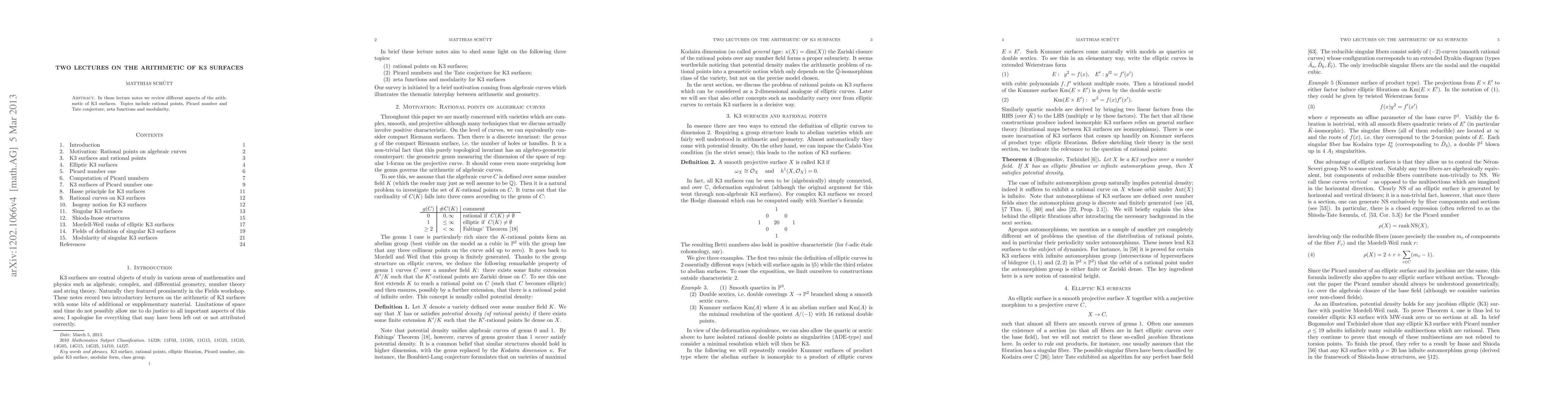 Two-line summary: This paper reviews various arithmetic aspects of K3 surfaces, focusing on rational points, the Picard number, the Tate conjecture, and connections between zeta functions and modularity. The lectures provide insights into the deep interplay between algebraic geometry and number theory in the context of K3 surfaces.