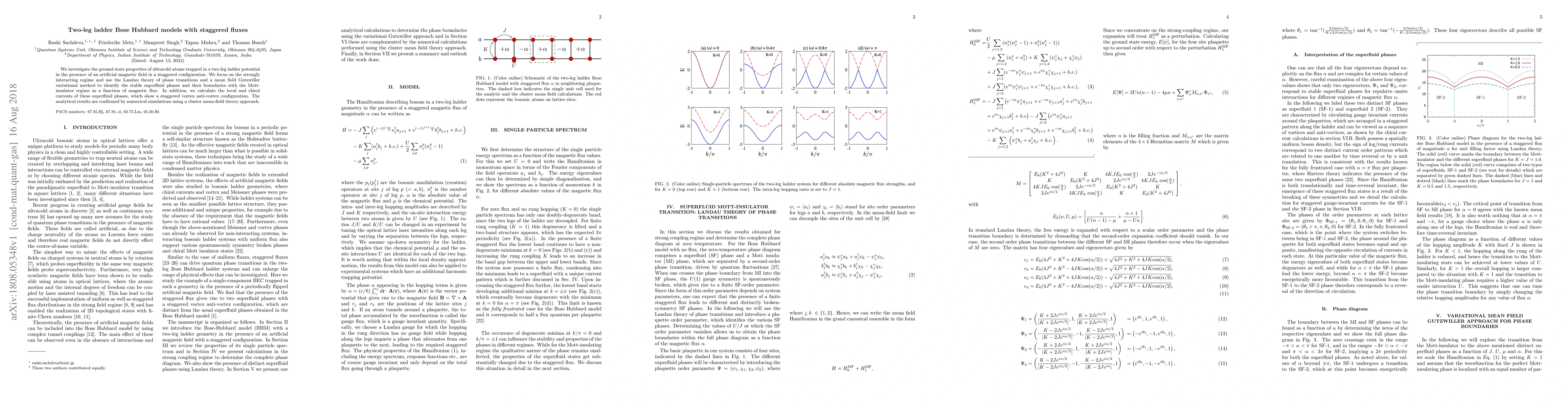 We investigate the ground state properties of ultracold atoms trapped in a two-leg ladder potential in the presence of an artificial magnetic field in a staggered configuration. We focus on the strongly interacting regime and use the Landau theory of phase transitions and a mean field Gutzwiller variational method to identify the stable superfluid phases and their boundaries with the Mott-insulator regime as a function of magnetic flux. In addition, we calculate the local and chiral currents of these superfluid phases, which show a staggered vortex anti-vortex configuration. The analytical results are confirmed by numerical simulations using a cluster mean-field theory approach.