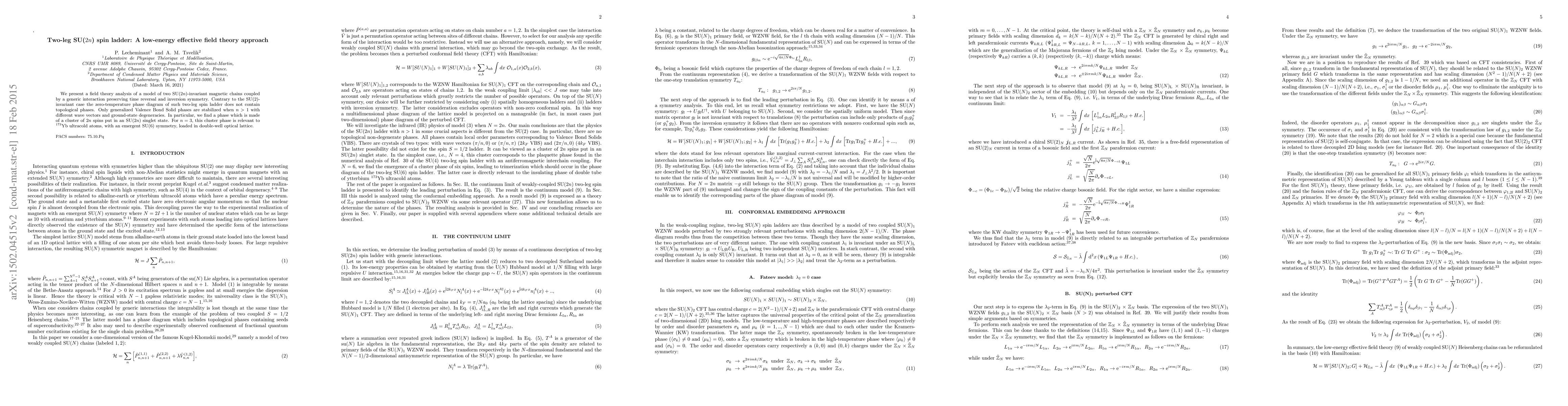 We present a field theory analysis of a model of two SU(2n)-invariant magnetic chains coupled by a generic interaction preserving time reversal and inversion symmetry. Contrary to the SU(2)-invariant case the zero-temperature phase diagram of such two-leg spin ladder does not contain topological phases. Only generalized Valence Bond Solid phases are stabilized when n>1 with different wave vectors and ground-state degeneracies. In particular, we find a phase which is made of a cluster of 2n spins put in an SU(2n) singlet state. For n=3, this cluster phase is relevant to ytterbium ultracold atoms, with an emergent SU(6) symmetry, loaded in double well optical lattice.