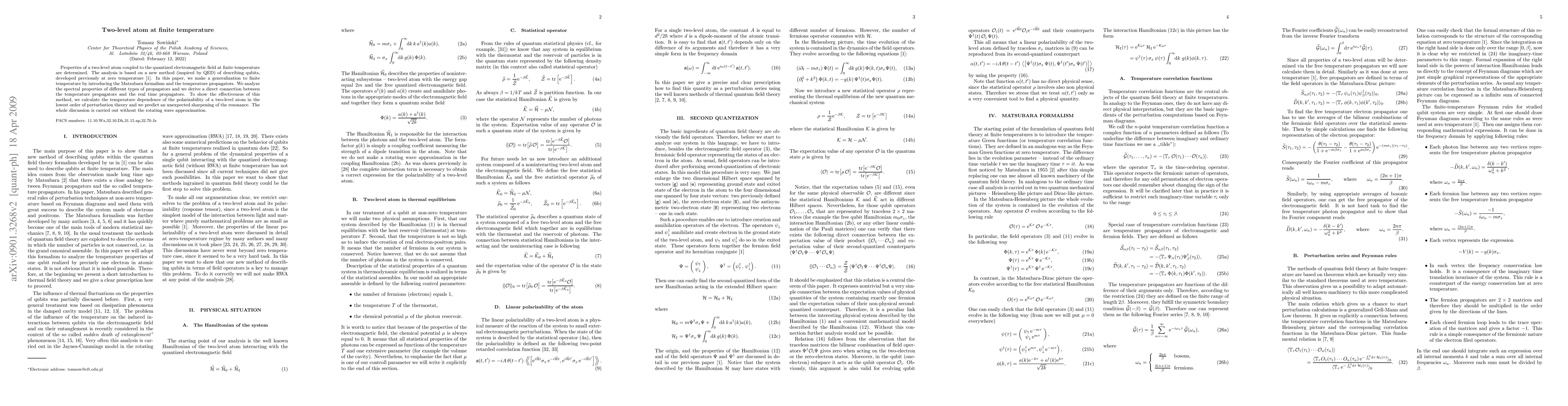 Properties of a two-level atom coupled to the quantized electromagnetic field at finite temperature are determined. The analysis is based on a new method (inspired by QED) of describing qubits, developed previously at zero temperature (Phys. Rev. A 76, 062106 (2007)). In this paper, we make a generalization to finite temperature by introducing the Matsubara formalism and the temperature propagators. We analyze the spectral properties of different types of propagators and we derive a direct connection between the temperature propagators and the real time propagators. To show the effectiveness of this method, we calculate the temperature dependence of the polarizability of a two-level atom in the lowest order of perturbation theory and we predict an unexpected sharpening of the resonance. The whole discussion is carried out without the rotating wave approximation.