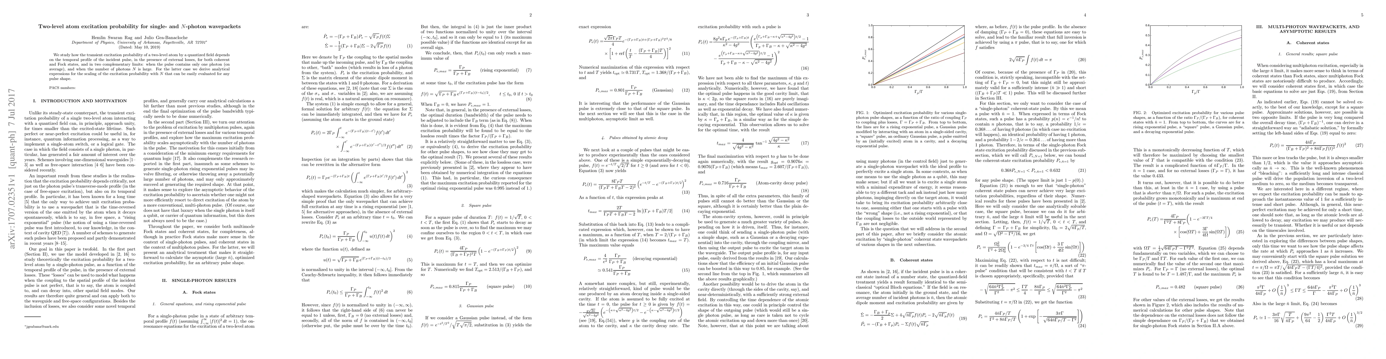 This paper investigates the transient excitation probability of a two-level atom by single-photon and large $N$-photon wavepackets, considering external losses and both coherent and Fock states. Analytical expressions for the excitation probability scaling with $N$ are derived for large photon numbers.