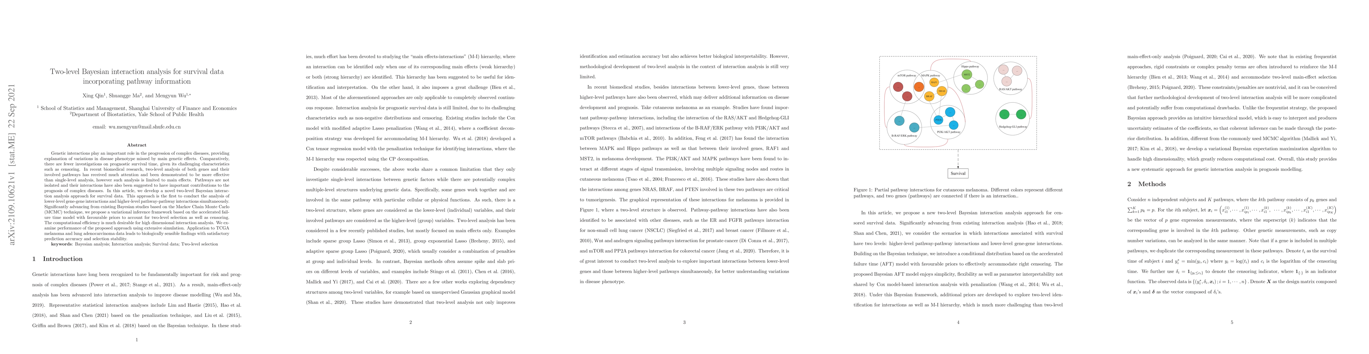 This paper introduces a novel two-level Bayesian interaction analysis for survival data, incorporating both gene-gene and pathway-pathway interactions. The proposed variational inference framework enhances computational efficiency and provides better handling of censoring, leading to biologically meaningful findings in TCGA melanoma and lung adenocarcinoma datasets.