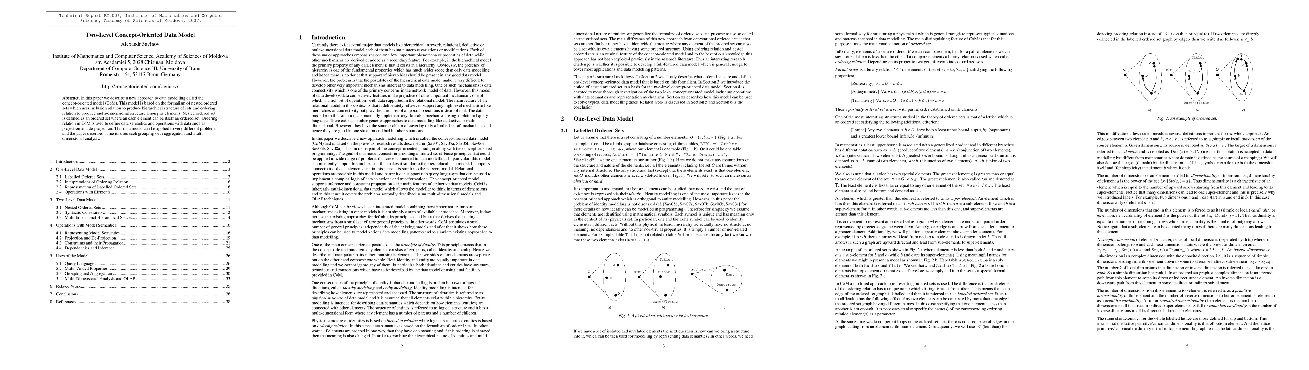 In this paper we describe a new approach to data modelling called the concept-oriented model (CoM). This model is based on the formalism of nested ordered sets which uses inclusion relation to produce hierarchical structure of sets and ordering relation to produce multi-dimensional structure among its elements. Nested ordered set is defined as an ordered set where an each element can be itself an ordered set. Ordering relation in CoM is used to define data semantics and operations with data such as projection and de-projection. This data model can be applied to very different problems and the paper describes some its uses such grouping with aggregation and multi-dimensional analysis.