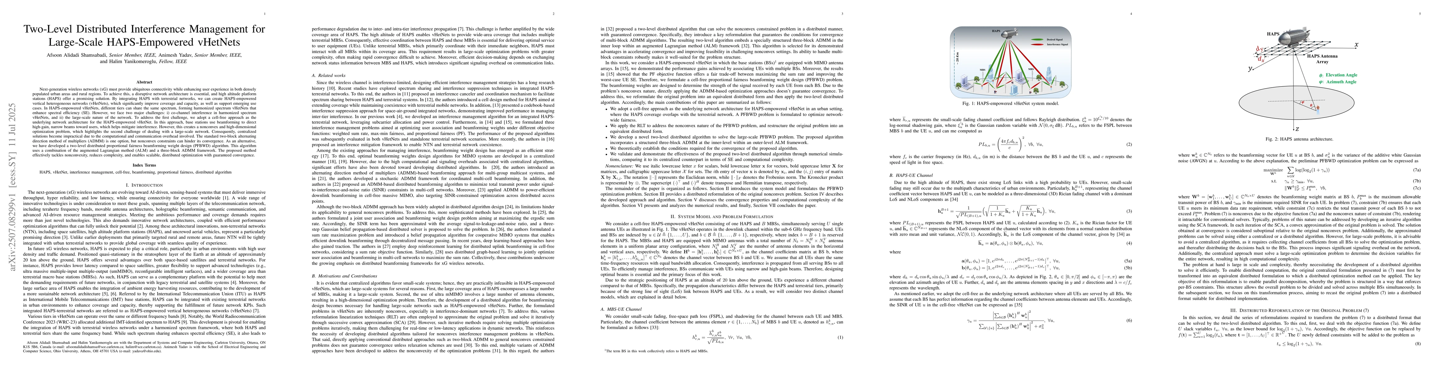 Next-generation wireless networks (xG) must provide ubiquitous connectivity while enhancing user experience in both densely populated urban areas and rural regions. To achieve this, a disruptive network architecture is essential, and high altitude platform stations (HAPS) offer a promising solution. By integrating HAPS with terrestrial networks, we can create HAPS-empowered vertical heterogeneous networks (vHetNets), which significantly improve coverage and capacity, as well as support emerging use cases. In HAPS-empowered vHetNets, different tiers can share the same spectrum, forming harmonized spectrum vHetNets that enhance spectral efficiency (SE). However, we face two major challenges: i) co-channel interference in harmonized spectrum vHetNets, and ii) the large-scale nature of the network. To address the first challenge, we adopt a cell-free approach as the underlying network architecture for the HAPS-empowered vHetNet. In this approach, base stations use beamforming to direct high-gain, narrow beams toward users, which helps mitigate interference. However, this creates a nonconvex and high-dimensional optimization problem, which highlights the second challenge of dealing with a large-scale network. Consequently, centralized solutions become impractical due to the computational and communication overhead involved. The standard two-block alternating direction method of multipliers (ADMM) is one option, but nonconvex constraints can hinder its convergence. As an alternative, we have developed a two-level distributed proportional fairness beamforming weight design (PFBWD) algorithm. This algorithm uses a combination of the augmented Lagrangian method (ALM) and a three-block ADMM framework. The proposed method effectively tackles nonconvexity, reduces complexity, and enables scalable, distributed optimization with guaranteed convergence.