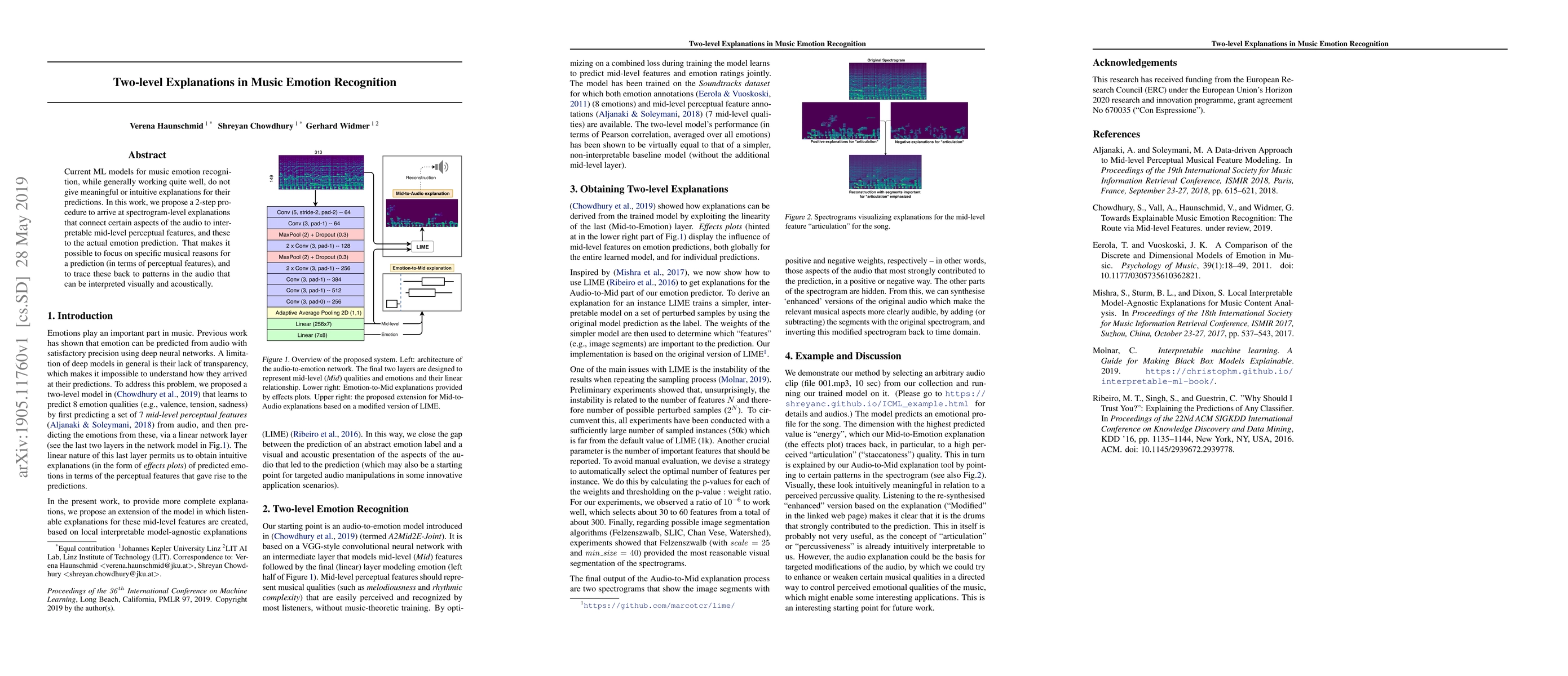 This paper proposes a two-step method for music emotion recognition that provides meaningful explanations by linking audio patterns to interpretable mid-level perceptual features, enabling better understanding and visualization of the model's decision-making process.
