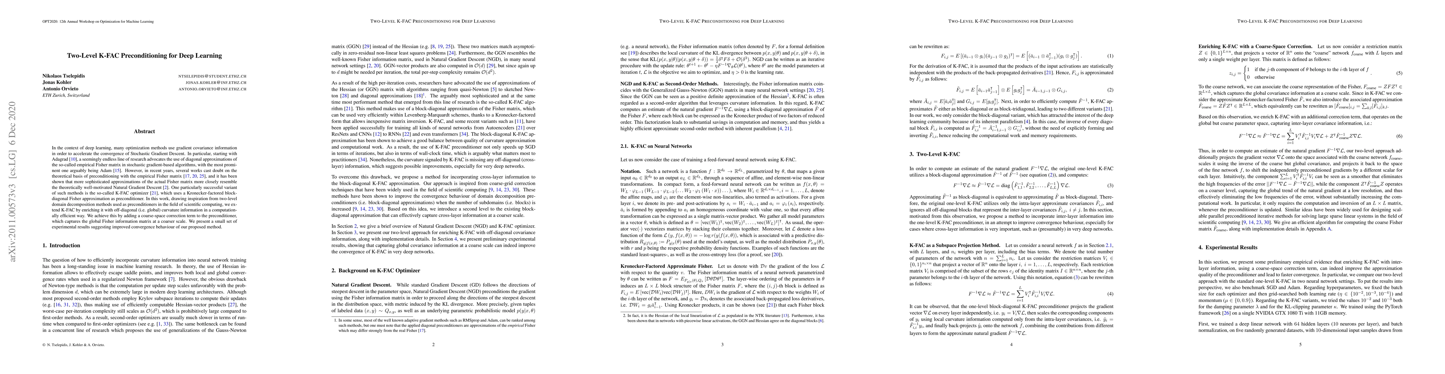 This paper proposes a two-level preconditioning method for the K-FAC optimizer in deep learning by incorporating off-diagonal curvature information through a coarse-space correction. Experimental results indicate enhanced convergence performance compared to traditional K-FAC.