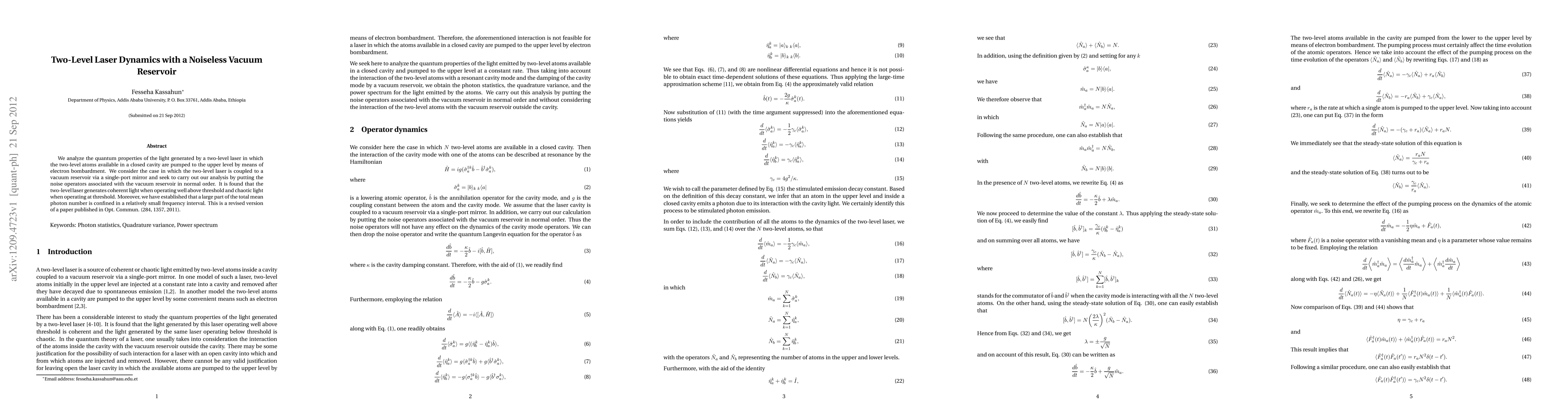 This paper investigates the quantum dynamics of a two-level laser coupled to a noiseless vacuum reservoir, revealing that it generates coherent light above threshold and chaotic light at threshold, with most photons concentrated in a narrow frequency range.