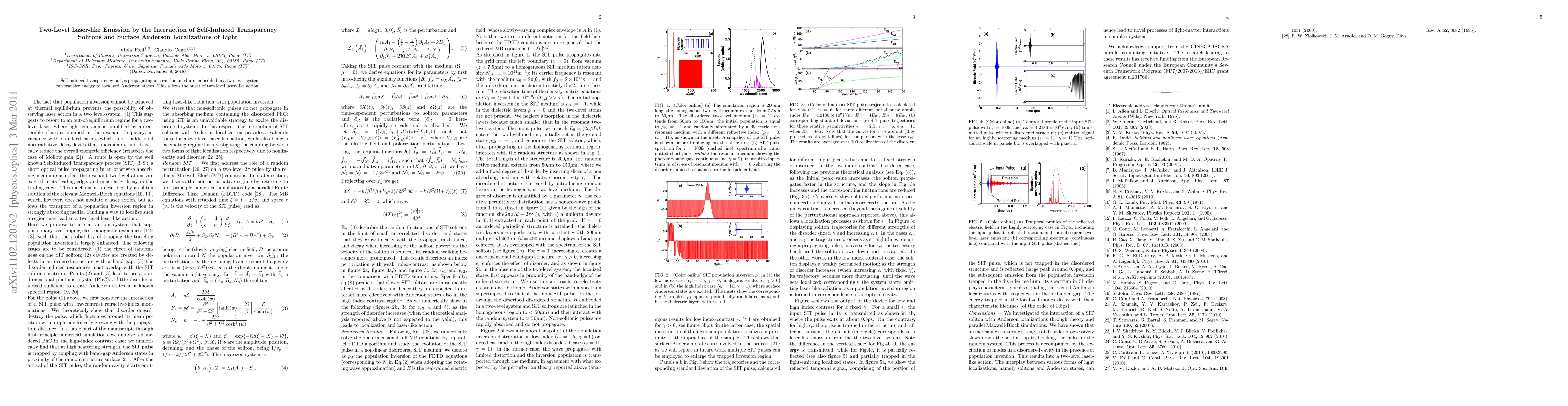This paper explores how self-induced transparency solitons interacting with surface Anderson localizations in a random medium can lead to two-level laser-like emission, demonstrating energy transfer to localized states.