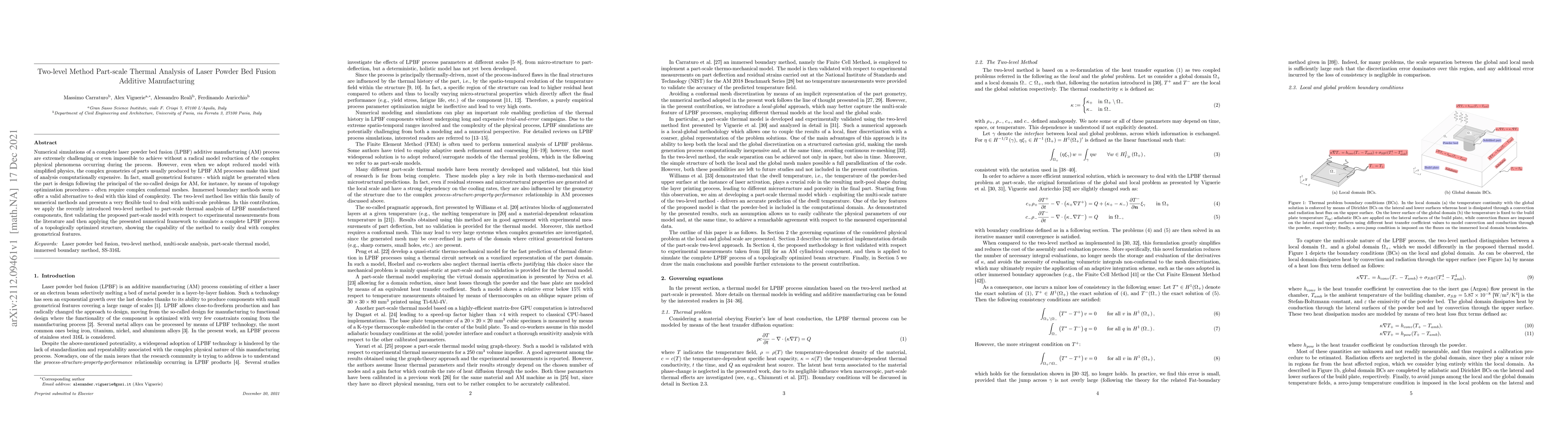 This paper presents a two-level method for part-scale thermal analysis in laser powder bed fusion additive manufacturing, validated against experimental data and applied to simulate a topologically optimized structure, demonstrating the method's flexibility in handling complex geometries.
