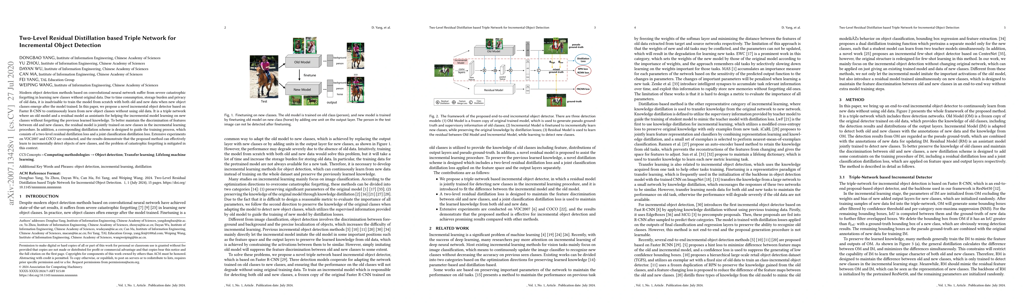 A new object detection method proposes a triple network that learns from old data without forgetting previous knowledge, effectively mitigating catastrophic forgetting when new classes emerge. The method achieves significant improvements on VOC2007 and COCO datasets.