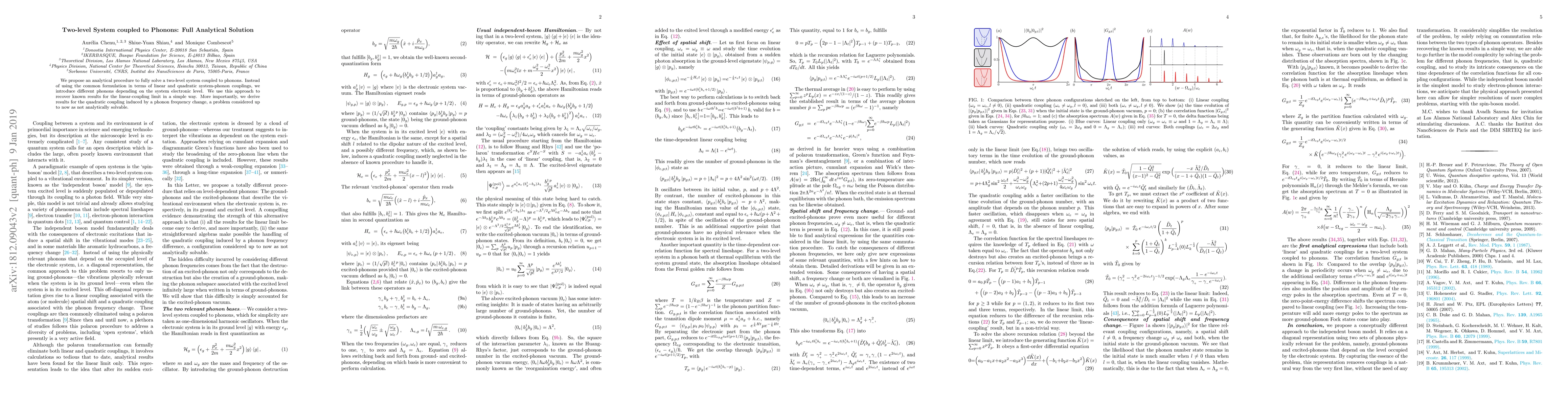 We propose an analytical procedure to fully solve a two-level system coupled to phonons. Instead of using the common formulation in terms of linear and quadratic system-phonon couplings, we introduce different phonons depending on the system electronic level. We use this approach to recover known results for the linear-coupling limit in a simple way. More importantly, we derive results for the quadratic coupling induced by a phonon frequency change, a problem considered up to now as not analytically solvable.