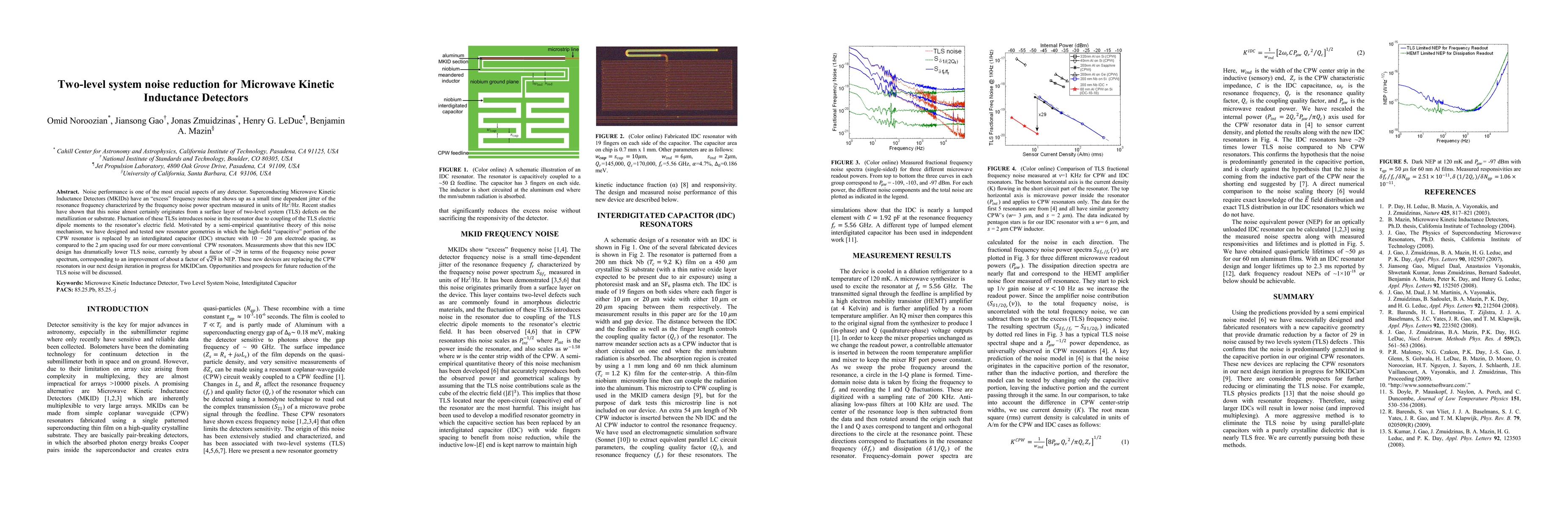 This paper investigates the noise performance of Superconducting Microwave Kinetic Inductance Detectors (MKIDs), focusing on reducing the "excess" frequency noise caused by two-level system (TLS) defects. The new interdigitated capacitor (IDC) resonator design significantly reduces TLS noise by a factor of ~29, improving the noise equivalent power (NEP) by a factor of 29^(1/2).