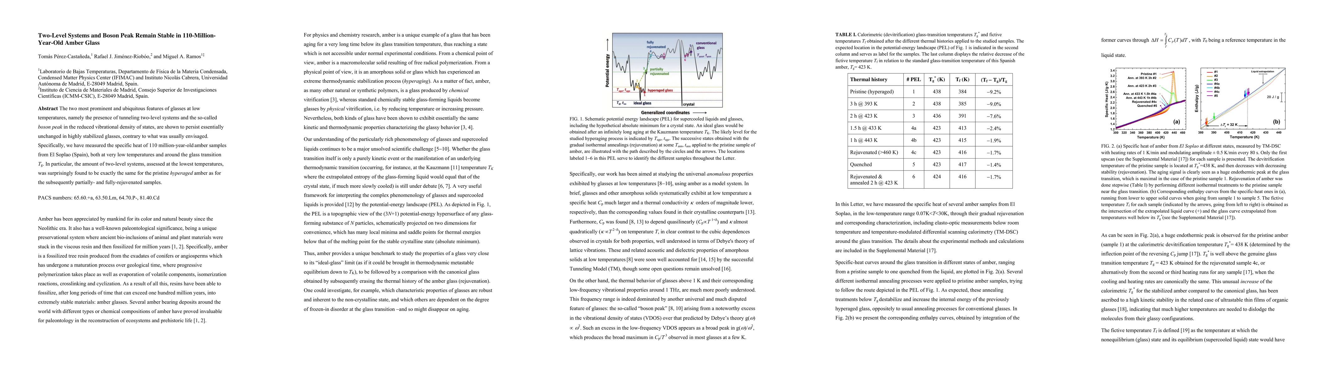 This study reveals that two-level systems and the boson peak in glasses remain stable over geological time scales, as evidenced by the unchanged specific heat measurements in 110-million-year-old amber from El Soplao, Spain, at both low temperatures and near the glass transition temperature. These findings challenge conventional assumptions about the aging of glass properties.