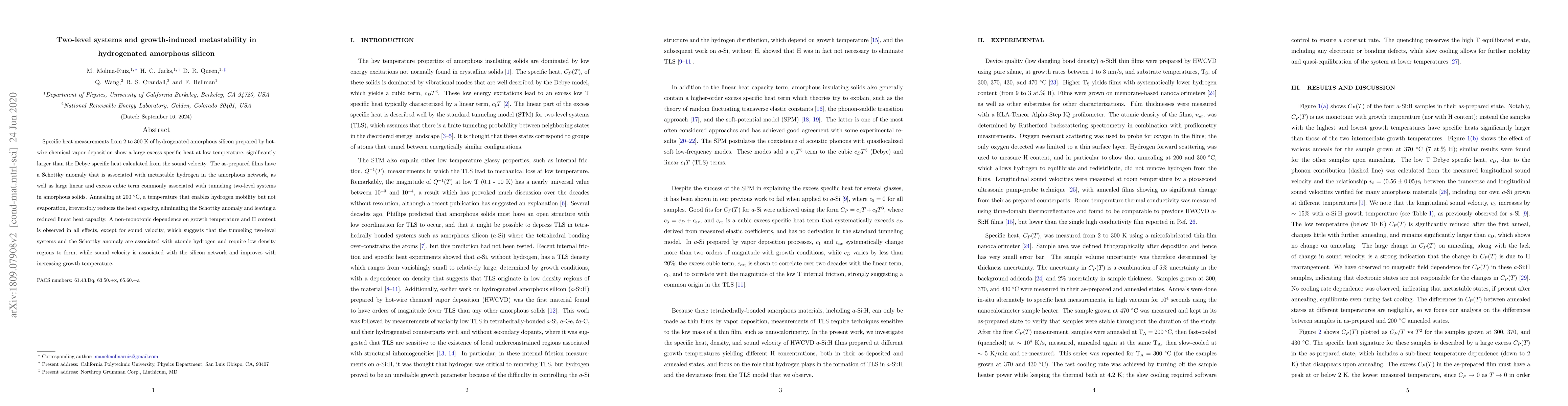 This study investigates hydrogenated amorphous silicon's specific heat, revealing a Schottky anomaly linked to metastable hydrogen and tunneling two-level systems. Annealing at 200°C reduces heat capacity and eliminates the anomaly, suggesting these phenomena are tied to atomic hydrogen and low-density regions.
