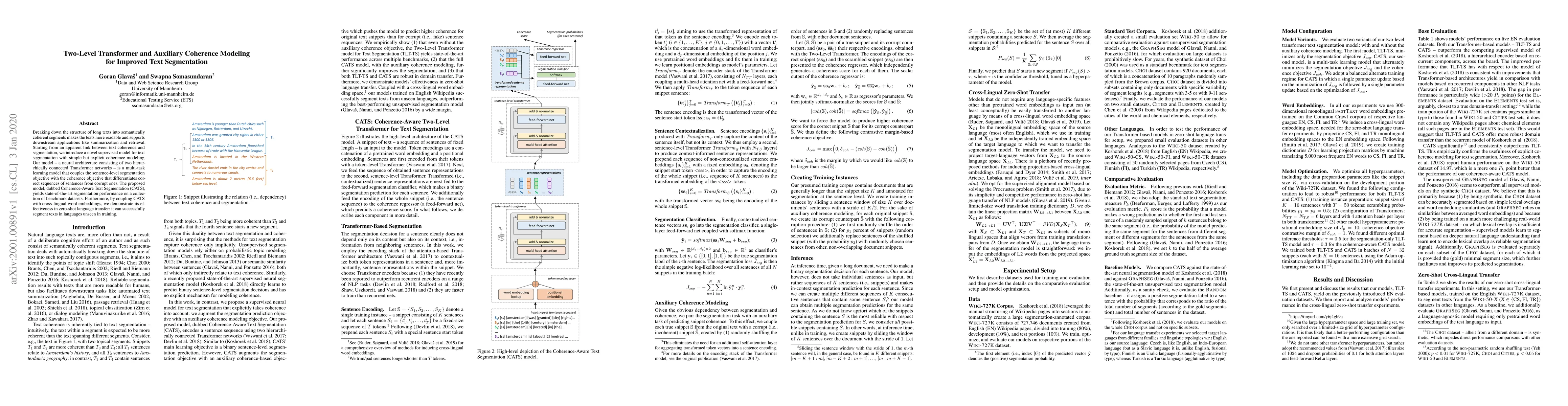 The paper introduces a novel supervised model called Coherence-Aware Text Segmentation (CATS) that uses a two-level Transformer architecture to enhance text segmentation by explicitly modeling text coherence. CATS achieves state-of-the-art performance on benchmark datasets and demonstrates zero-shot language transfer capabilities.