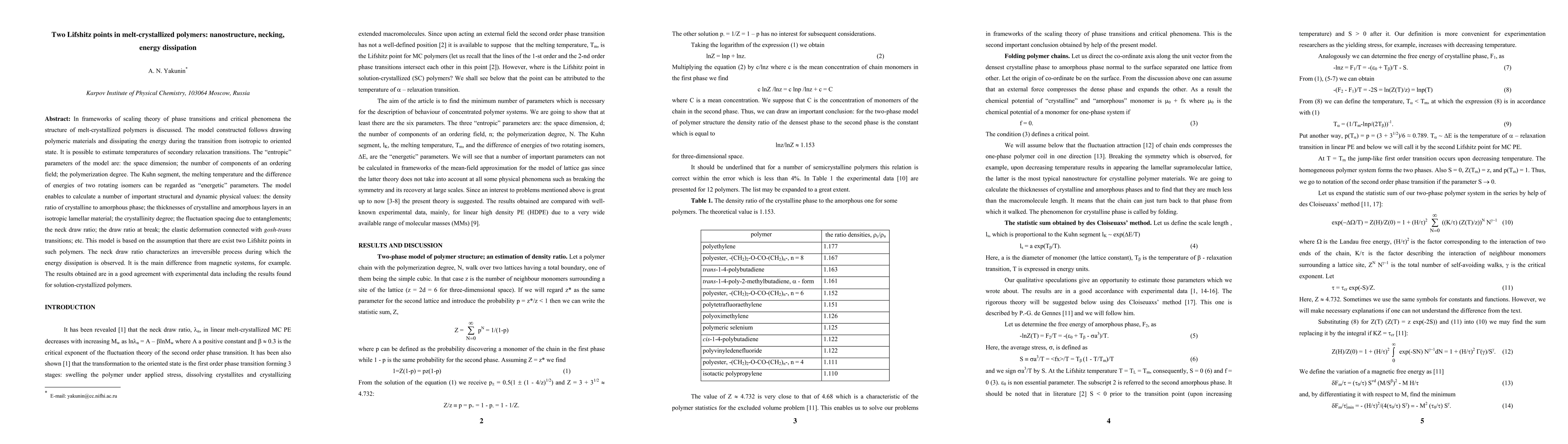 In frameworks of scaling theory of phase transitions and critical phenomena the structure of melt-crystallized polymers is discussed. The model constructed follows drawing polymeric materials and dissipating the energy during the transition from isotropic to oriented state. It is possible to estimate temperatures of secondary relaxation transitions. The entropic parameters of the model are: the space dimension; the number of components of an ordering field; the polymerization degree. The Kuhn segment, the melting temperature and the difference of energies of two rotating isomers can be regarded as energetic parameters. The model enables to calculate a number of important structural and dynamic physical values: the density ratio of crystalline to amorphous phase; the thicknesses of crystalline and amorphous layers in an isotropic lamellar material; the crystallinity degree; the fluctuation spacing due to entanglements; the neck draw ratio; the draw ratio at break; the elastic deformation connected with gosh-trans transitions; etc. This model is based on the assumption that there are exist two Lifshitz points in such polymers. The neck draw ratio characterizes an irreversible process during which the energy dissipation is observed. It is the main difference from magnetic systems, for example. The results obtained are in a good agreement with experimental data including the results found for solution-crystallized polymers.