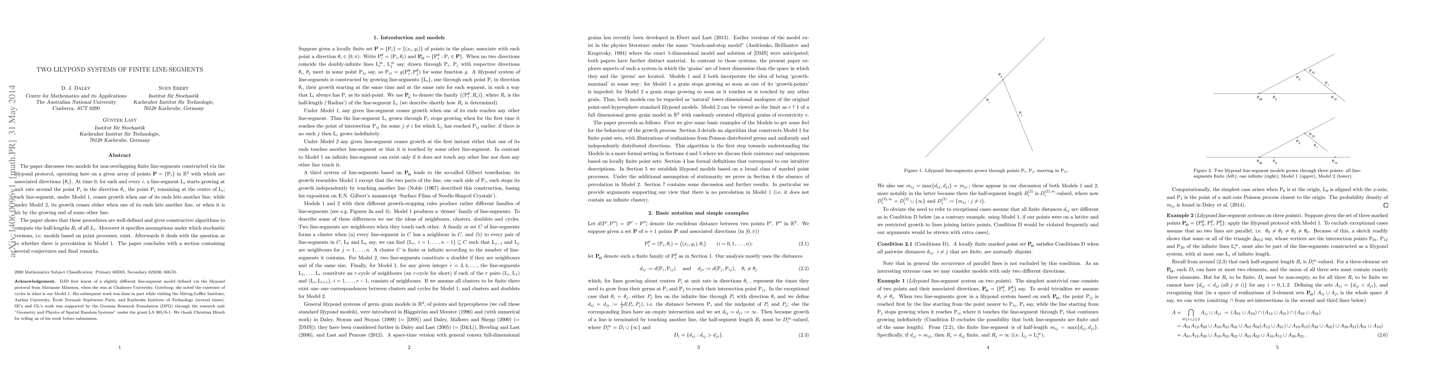The paper discusses two models for non-overlapping finite line-segments constructed via the lilypond protocol, operating here on a given array of points in the plane with which are associated directions. At time 0, each line-segment starts growing at unit rate around its center in the given direction; each line-segment, under Model 1, ceases growth when one of its ends hits another line, while under Model 2, its growth ceases either when one of its ends hits another line, or when it is hit by the growing end of some other line. The paper shows that these procedures are well-defined and gives constructive algorithms to compute the lengths of the segments. Moreover it specifies assumptions under which stochastic versions, i.e. models based on point processes, exist. Afterwards it deals with the question as to whether there is percolation in Model 1. The paper concludes with a section containing several conjectures and final remarks.