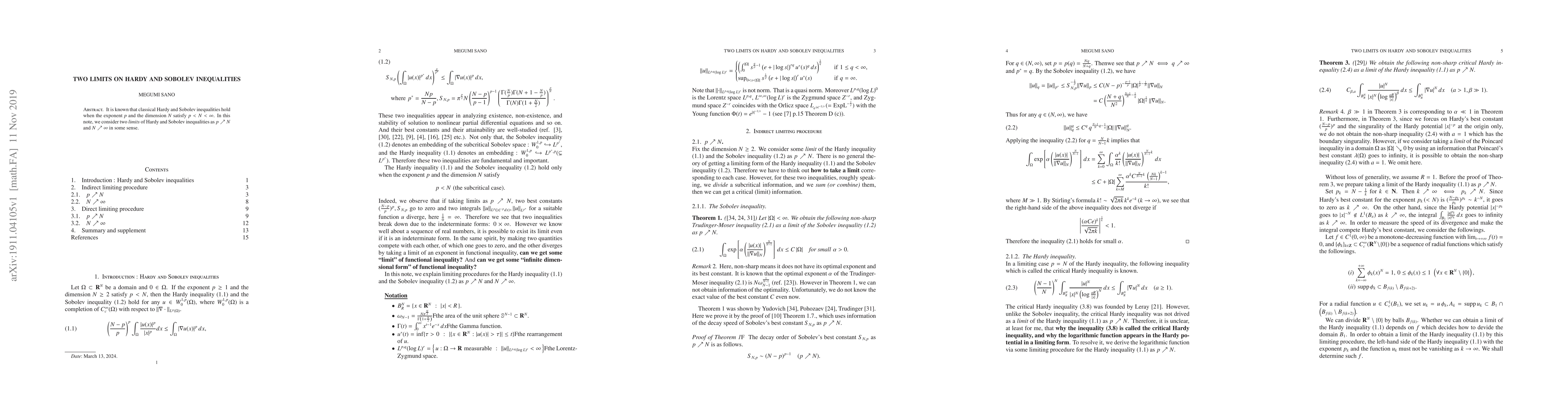 It is known that classical Hardy and Sobolev inequalities hold when the exponent $p$ and the dimension $N$ satisfy $p < N < \infty$. In this note, we consider two limits of Hardy and Sobolev inequalities as $p \nearrow N$ and $N \nearrow \infty$ in some sense.