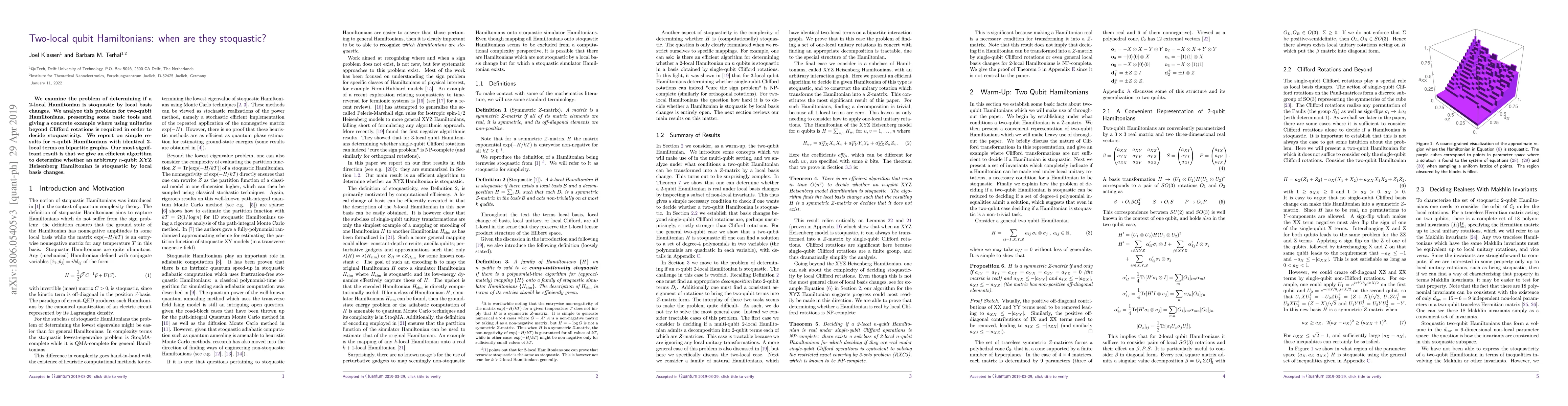 The paper analyzes the stoquasticity of two-local qubit Hamiltonians through local basis changes, focusing on two-qubit Hamiltonians and extending to n-qubit XYZ Heisenberg Hamiltonians. It introduces an efficient algorithm to determine stoquasticity by local unitary rotations, particularly using Clifford transformations and addressing cases requiring transformations beyond Clifford rotations.