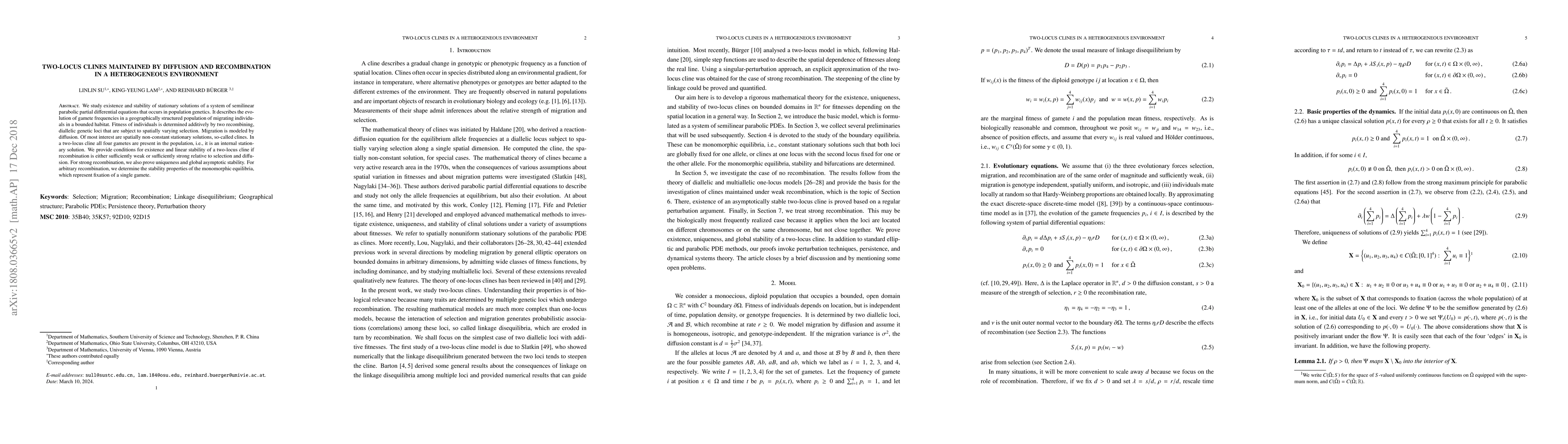 This paper investigates the existence and stability of two-locus clines in a population genetics model where gamete frequencies evolve under spatially varying selection, recombination, and diffusion. It provides conditions for the stability of these clines, proving uniqueness and global asymptotic stability for strong recombination.