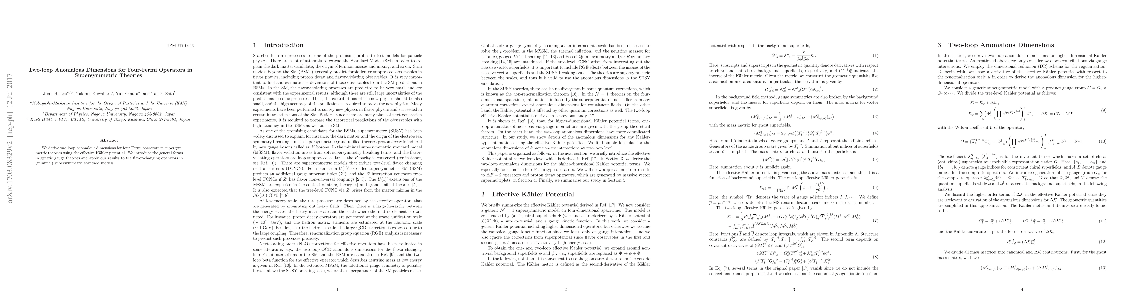 We derive two-loop anomalous dimensions for four-Fermi operators in supersymmetric theories using the effective Kahler potential. We introduce the general forms in generic gauge theories and apply our results to the flavor-changing operators in (minimal) supersymmetric standard models.