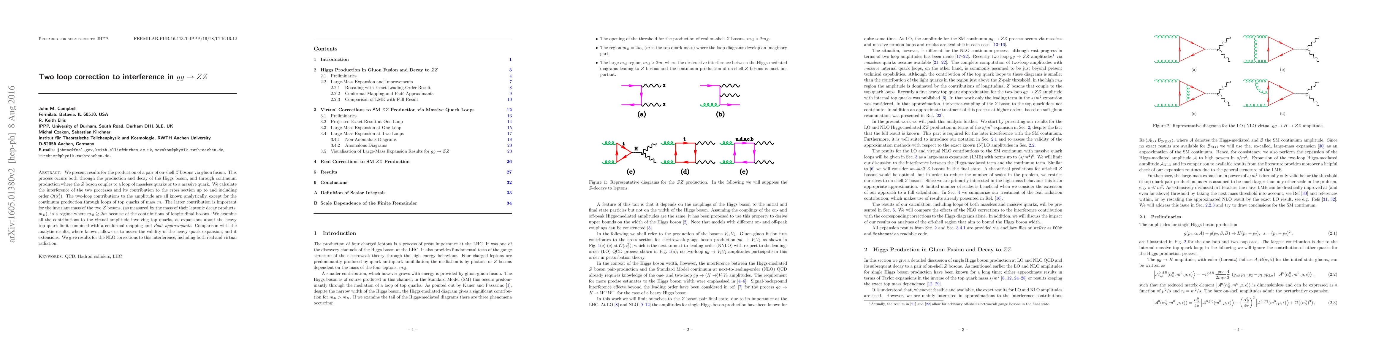 We present results for the production of a pair of on-shell Z bosons via gluon fusion. This process occurs both through the production and decay of the Higgs boson, and through continuum production where the Z boson couples to a loop of massless quarks or to a massive quark. We calculate the interference of the two processes and its contribution to the cross section up to and including order O(alpha_s^3). The two-loop contributions to the amplitude are all known analytically, except for the continuum production through loops of top quarks of mass m. The latter contribution is important for the invariant mass of the two Z bosons, (as measured by the mass of their leptonic decay products, m_4l), in a regime where m_4l > 2m because of the contributions of longitudinal bosons. We examine all the contributions to the virtual amplitude involving top quarks, as expansions about the heavy top quark limit. Comparison with the analytic results, where known, allows us to assess the validity of the heavy quark expansion, and it extensions. We give results for the NLO corrections to this interference, including both real and virtual radiation.
